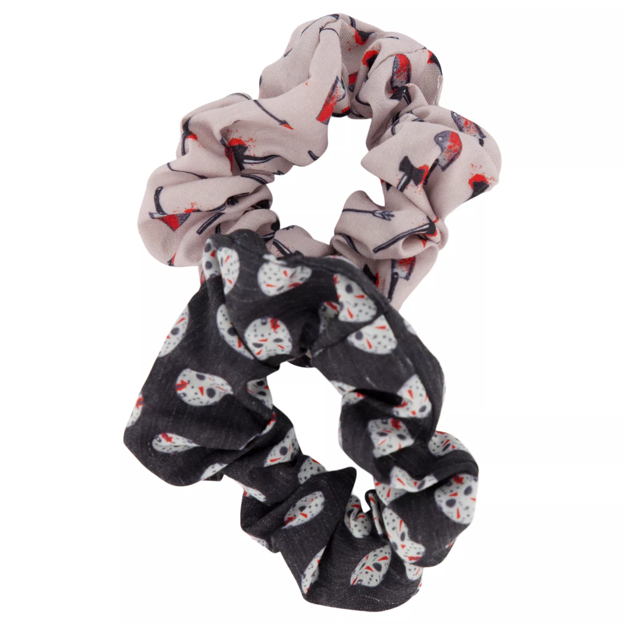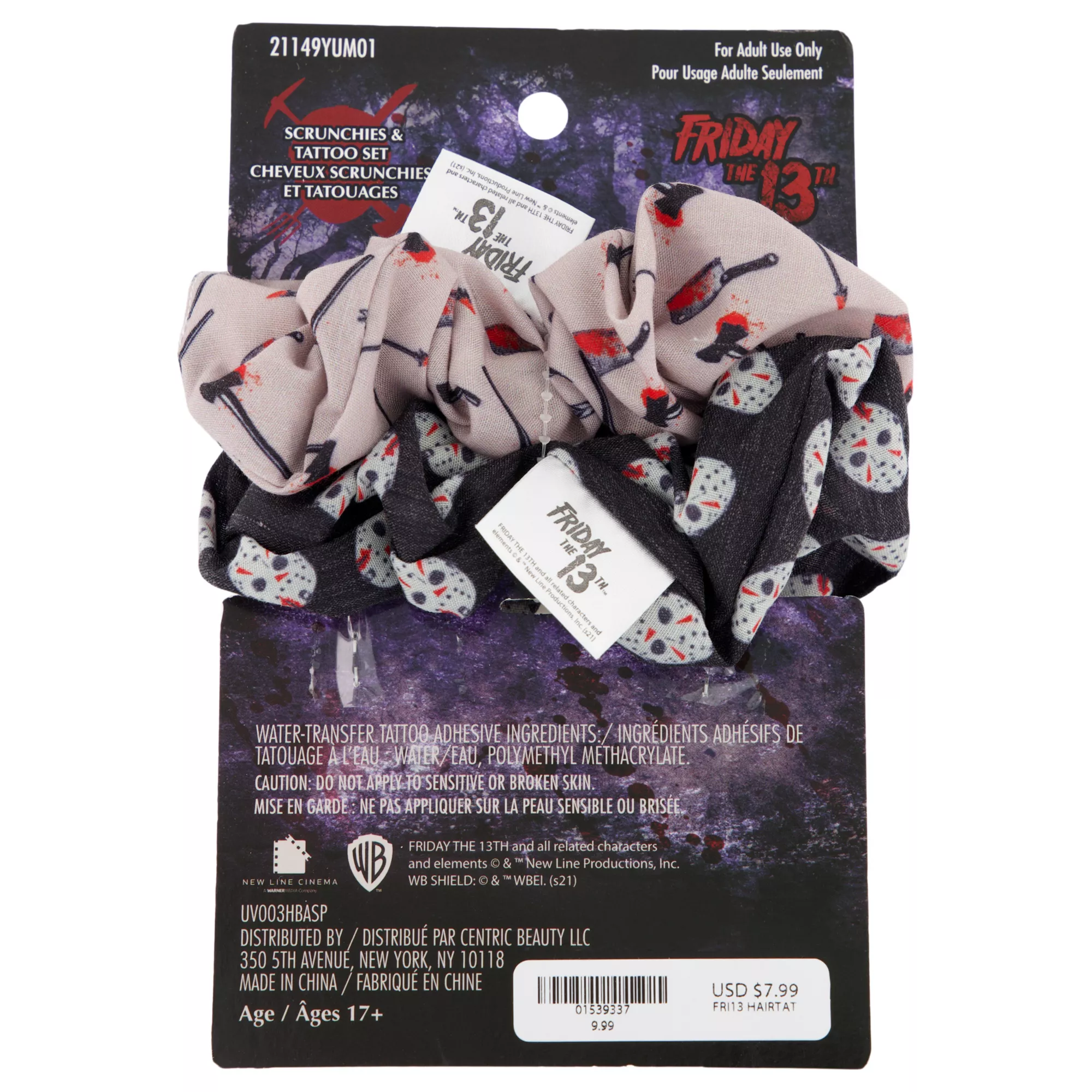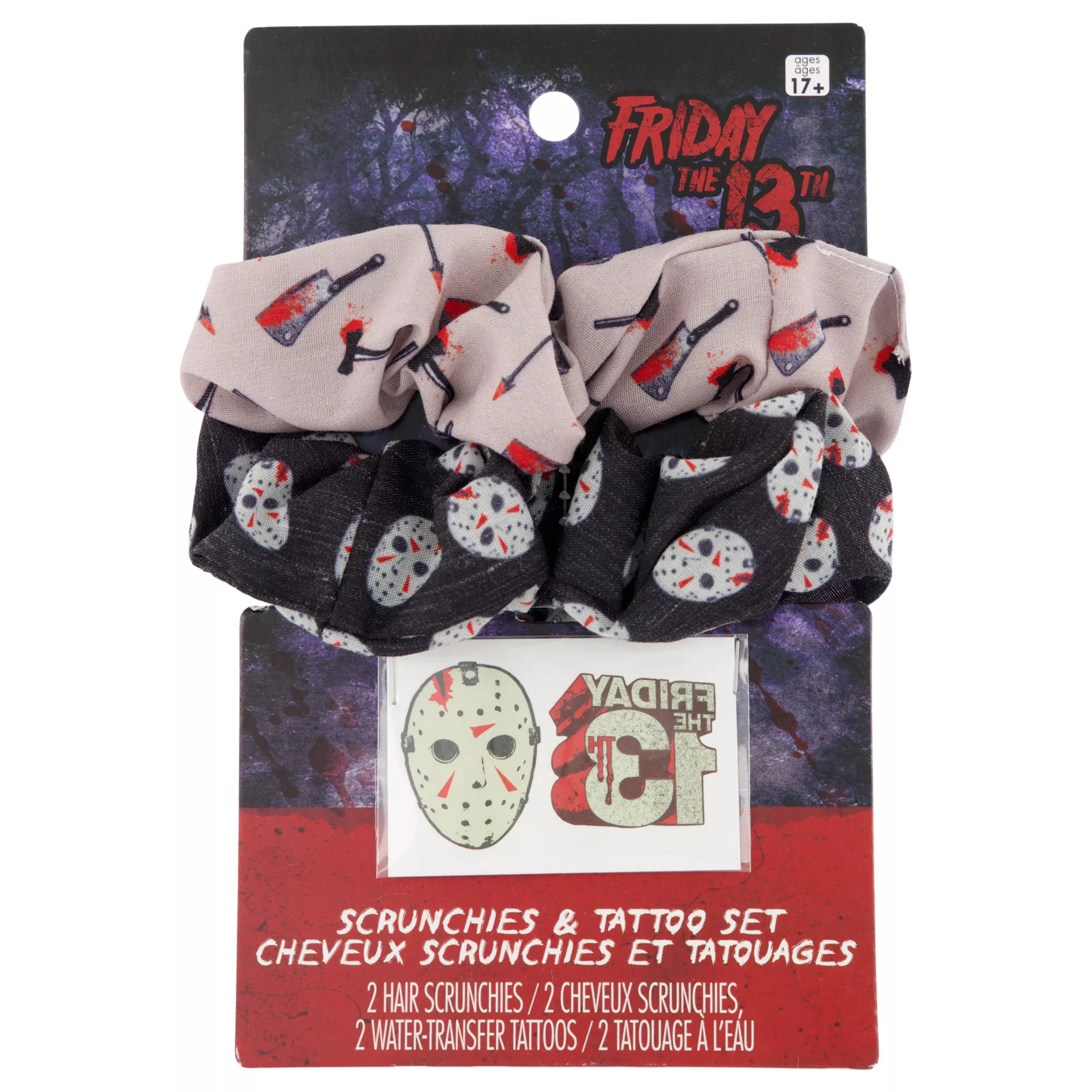Make your favorite horror movie part of your outfit any time with these official Friday the 13th Scrunchie and Temporary Tattoos! This fun set features scrunchies with Jason Voorhees in his mask and his weapons, and temporary tattoos to let you show how big a Friday the 13th fan you are!