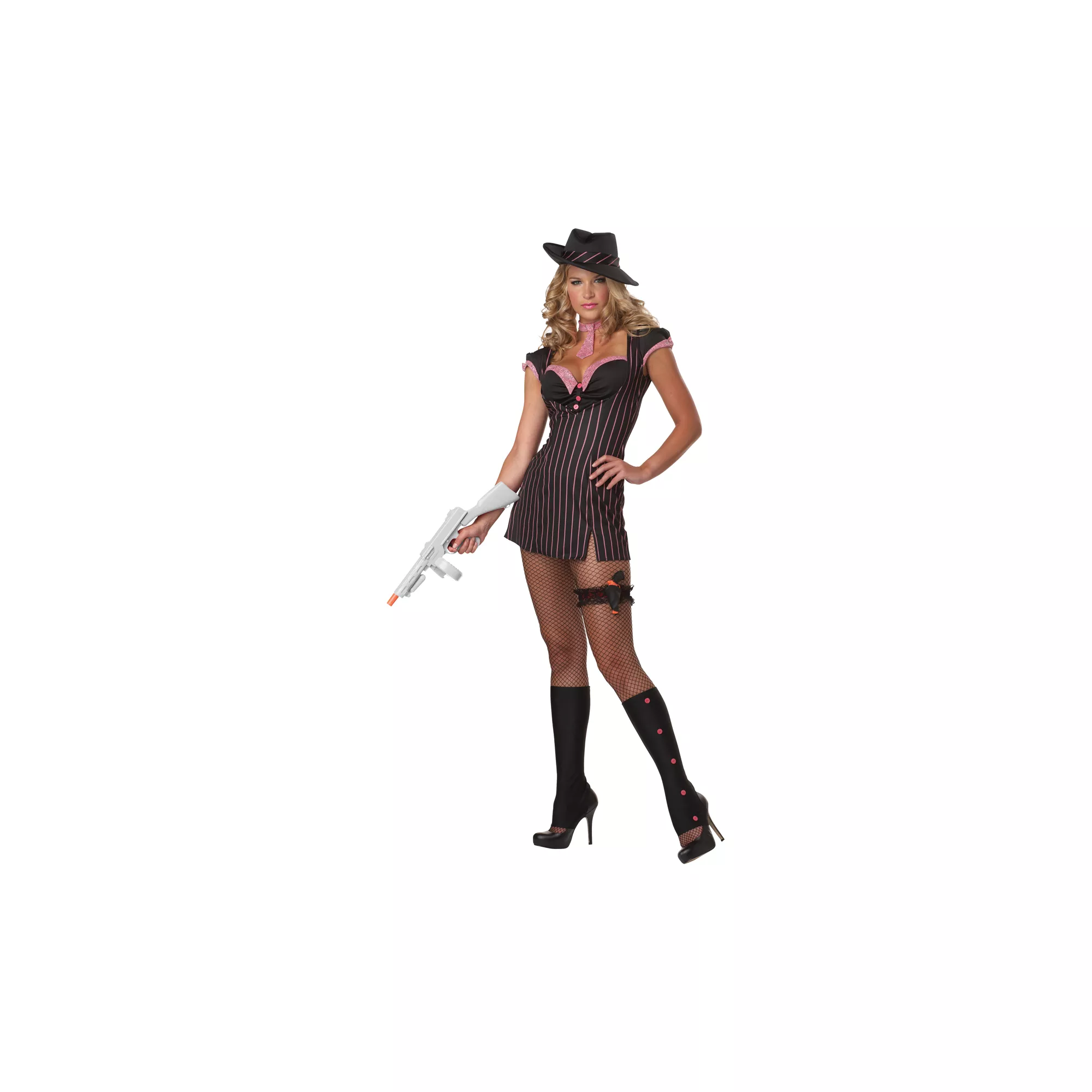 Make your own fun and be as bad as you want in this Gangster Moll adult womens costume. The black and pink pinstripe dress of this gangster costume comes complete with a matching hat, necktie and spats. You can get away with murder in this sexy costume!