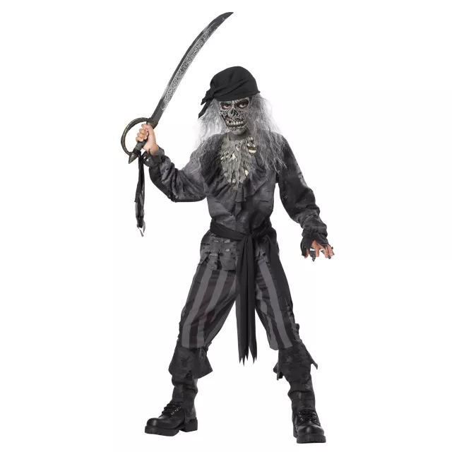 Create your own kind of spirit with this Ghost Ship Pirate child costume. The tattered gray and black shirt features a detachable chest piece, spooky half mask with attached scraggly hair, waist tie, black bandanna, boot covers and gray and black striped pants.