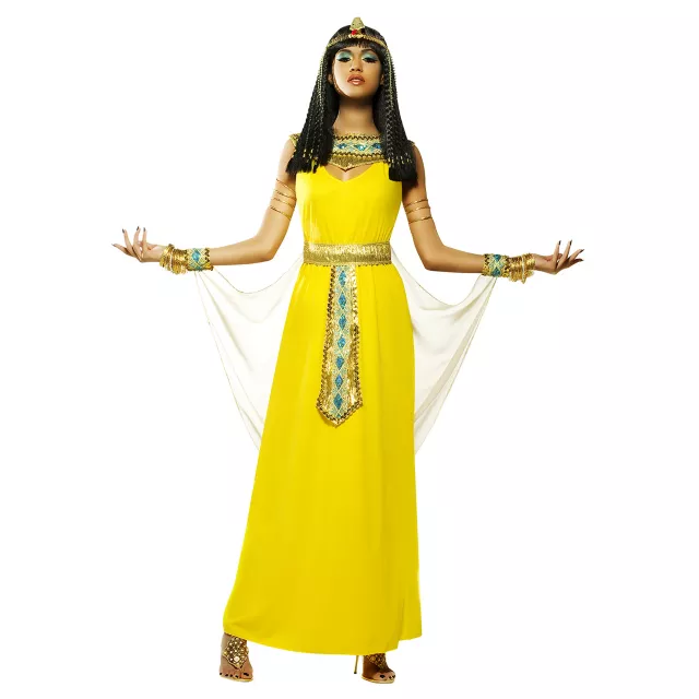 You'll feel enlightened by the heavens in this Goddess Cleo Adult Womens Costume. Bright yellow dress with gold sequin detail and turquoise accented belt, cuffs and collar will give you an enchanting appearance. Attached sheer cape and headpiece also included so you'll undoubtedly look and feel like royalty.