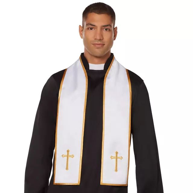 Whether you are a good or bad priest, this Gold Cross Scarf is a must have detail to makes you look even more official! The white scarf features gold edges and a golden cross on each end.