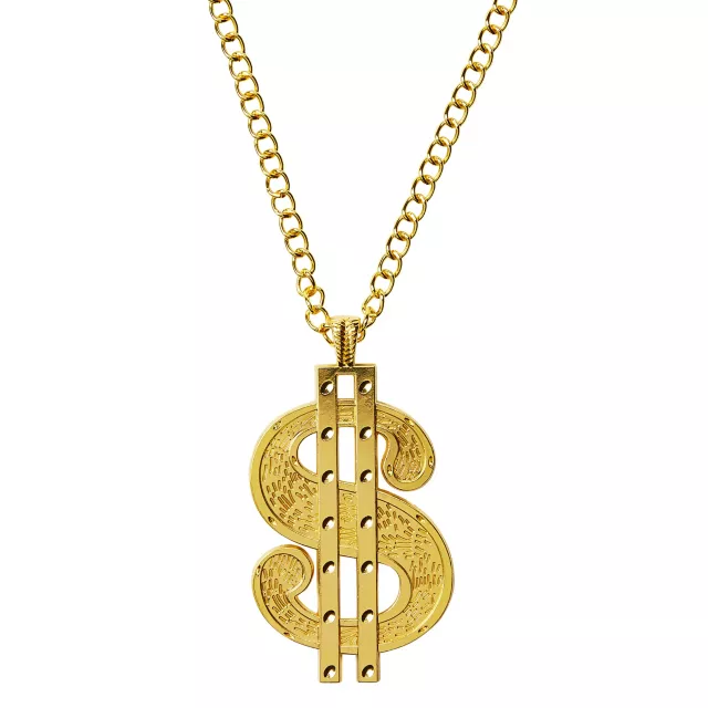 Keep yo mind on your money and the money on yo mind - wear too much bling you'll make a brother go blind! Blind them when you complete your hip hop costume with this faux gold dollar sign necklace.