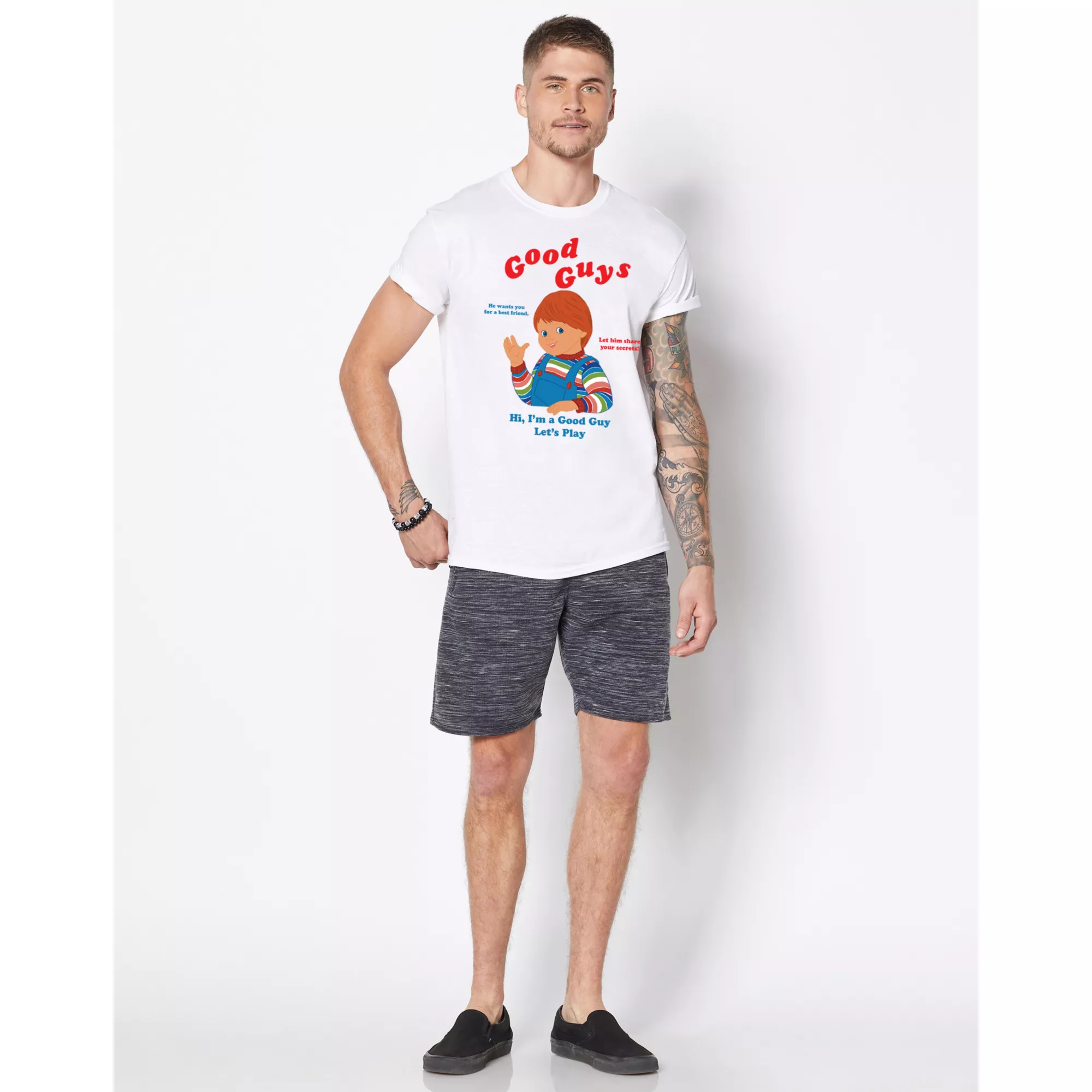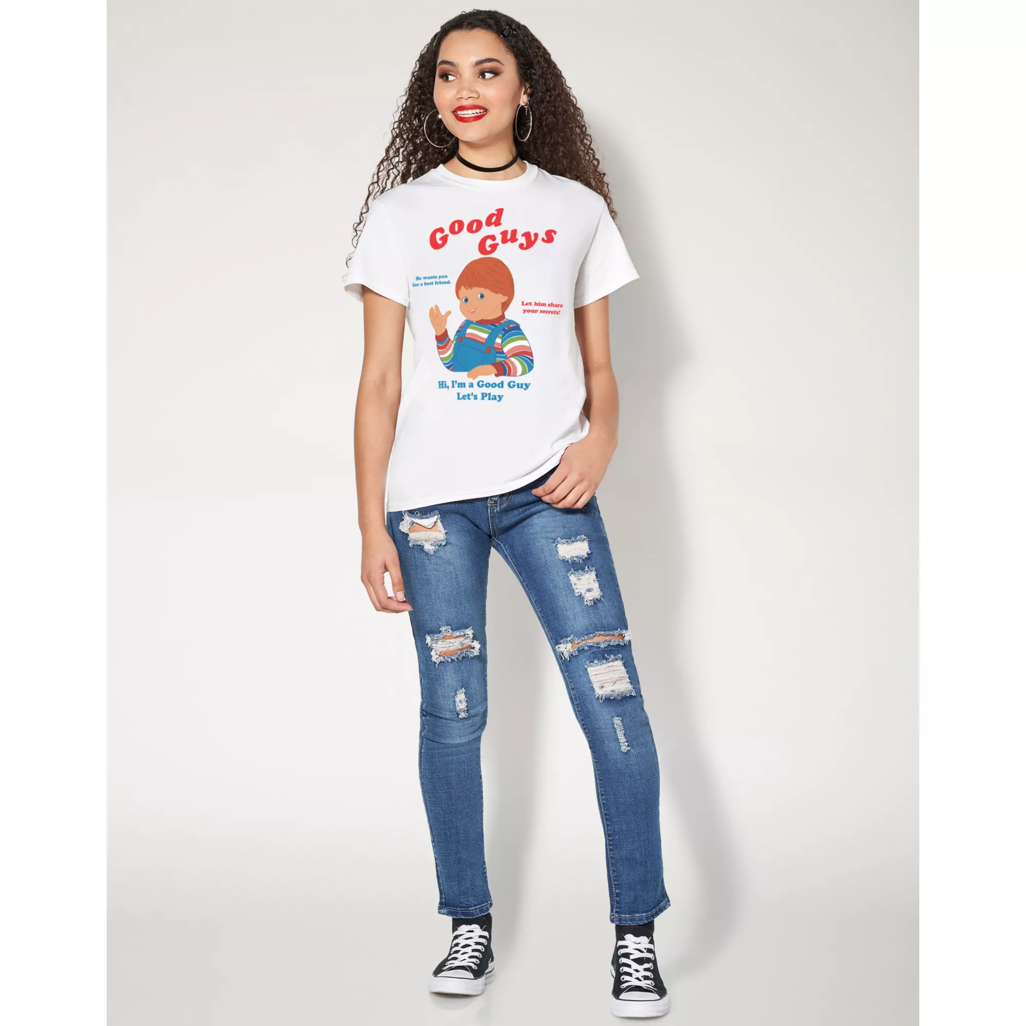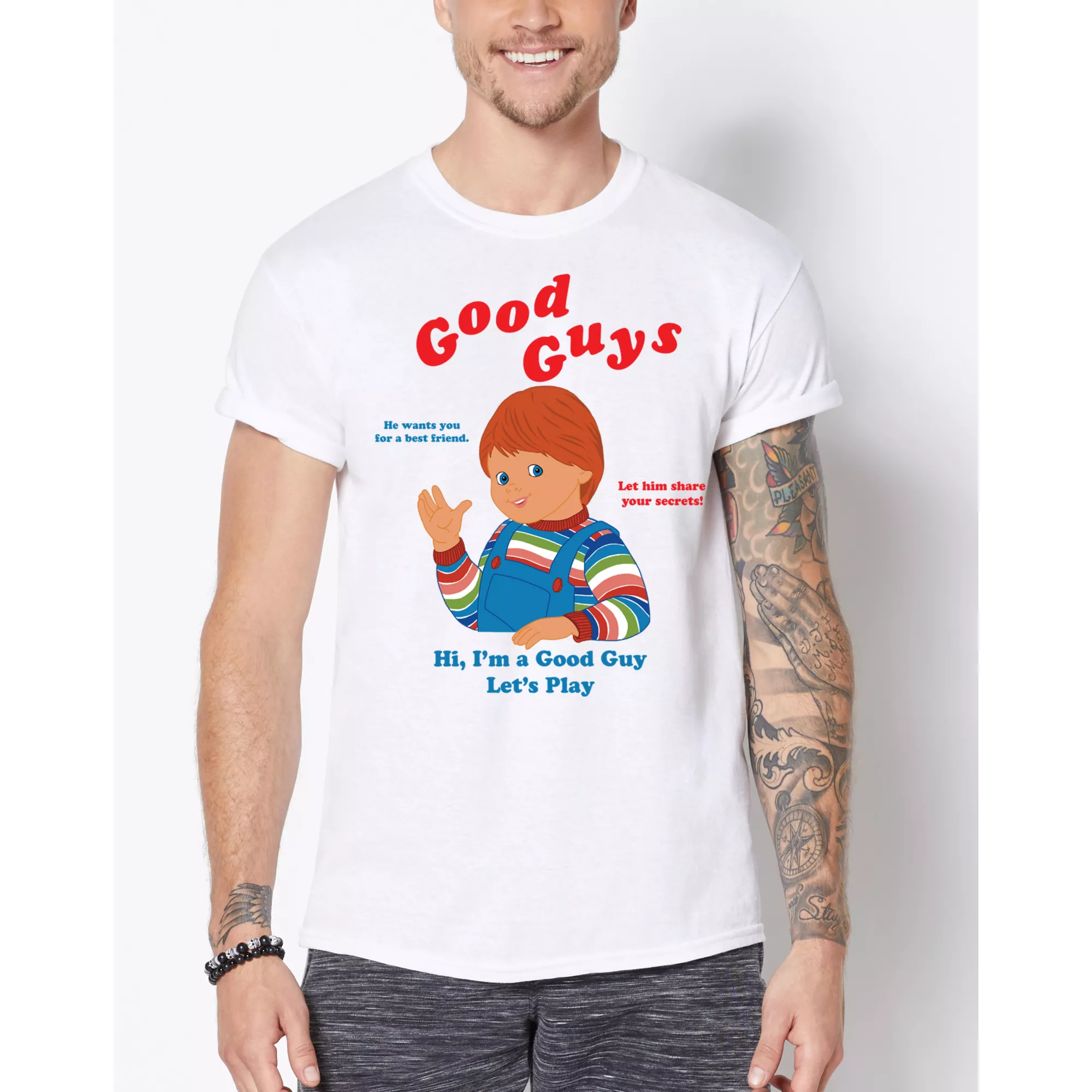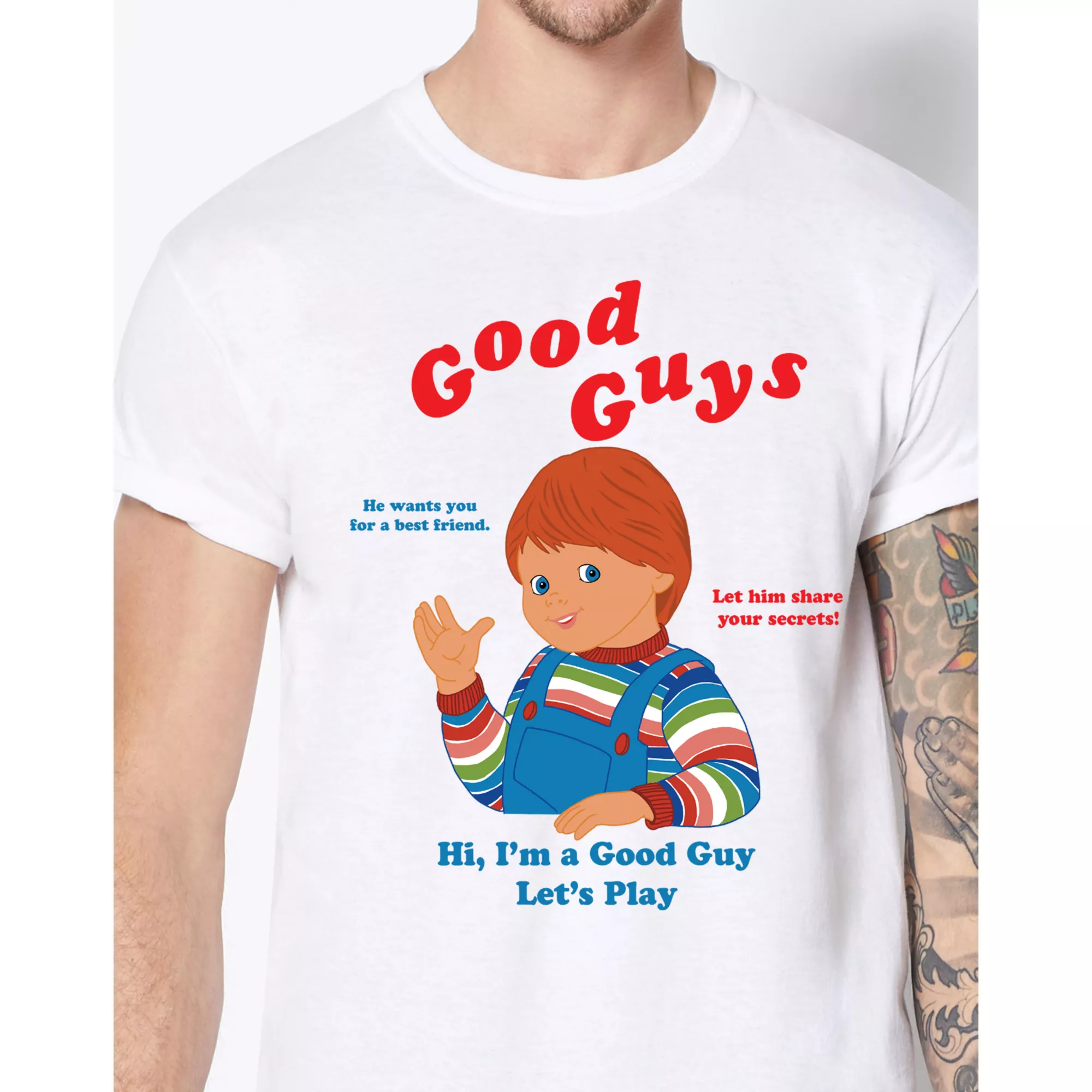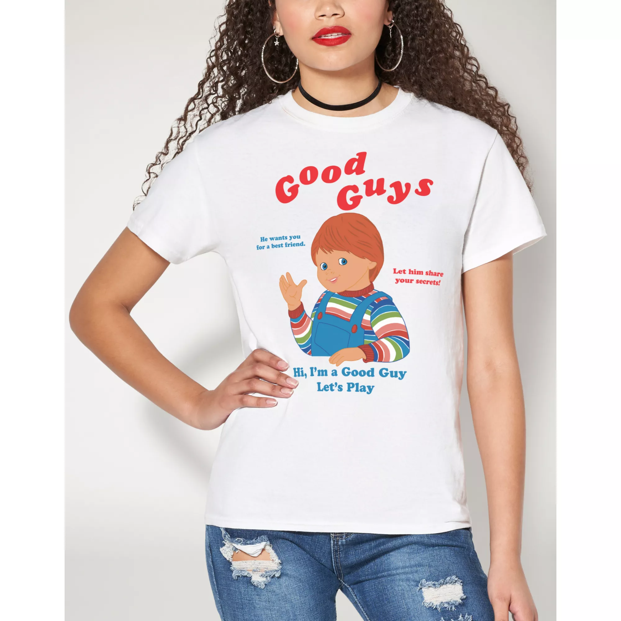 He wants you for a best friend! Let him share your secrets! Chucky is a good guy and he wants to play with you. What could go wrong? This soft, retro-inspired Good Guys T Shirt features everyone's favorite playmate, Chucky!