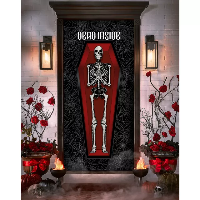 Have your home looking Halloween ready in seconds when you decorate your door with this Gothic Noir Skeleton Door Cover. Featuring a skeleton resting in a coffin on the front with the words "dead inside" on it, this door cover is great for adding some spooky vibes to your home.