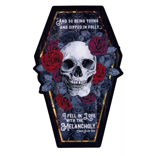 Put your dark side front and center with this Gothic Skull Coffin Magnet! This striking magnet is in the shape of a coffin, with a skull surrounded by roses, and has a quote by Edgar Allen Poe. It's the perfect magnet for our fridge during the Halloween season or any time.