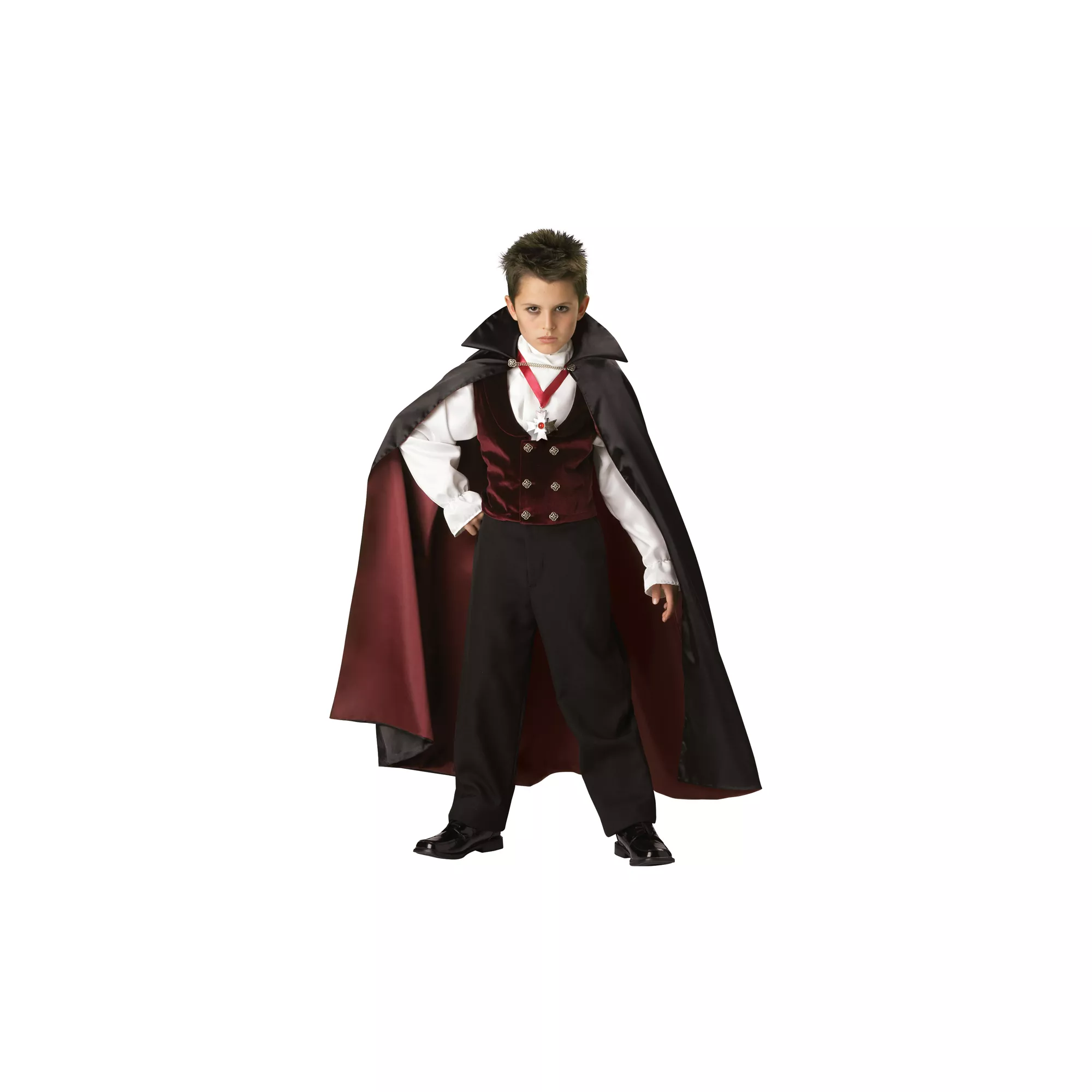 Dracula has nothing on you in this amazing Deluxe Gothic Vampire boys costume. The burgundy vest of this vampire costume features handsome double buttons and an attached white shirt with ruffled sleeves, complete with a white dickey shirt front with scarf collar, black pants, a medallion on a blood-red ribbon and a black and burgundy cape.