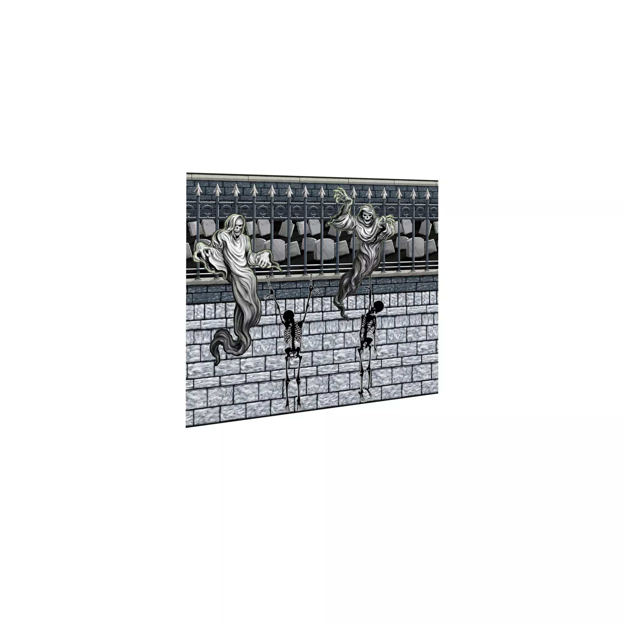 Transform doors, windows and walls into another world with this spooky black and white haunted cemetery kits. The Graveyard decoration kit includes four scene setters and two room rolls so you can cover a lot of territory.