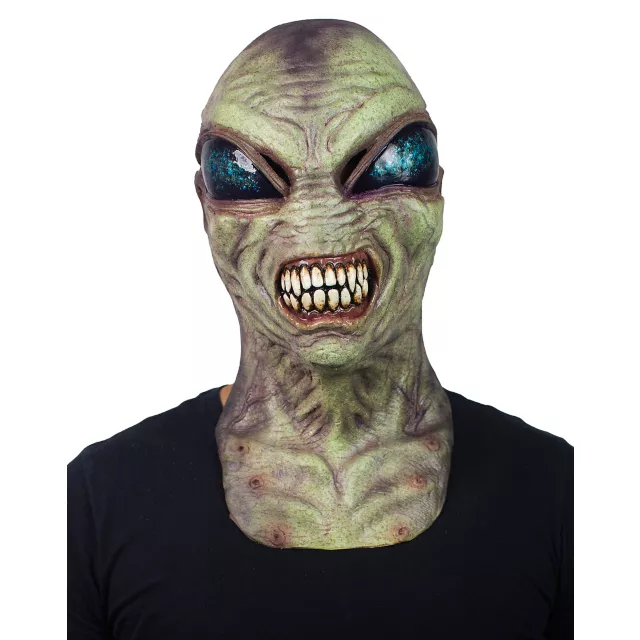 For a cosmically creepy look, this Green Alien Full Mask is sure to take your Halloween costume to the stars. This green alien mask features giant, otherworldly eyes, bared teeth, and a realistic texture that looks just like the real deal! Start your night of out-of-this-world fun with this awesome mask!