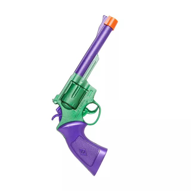 Bang bang! Complete your costume with this shiny accessory. This purple and green toy revolver makes a subtle pop sound when you pull the trigger. A must have addition to your Halloween costume this year!