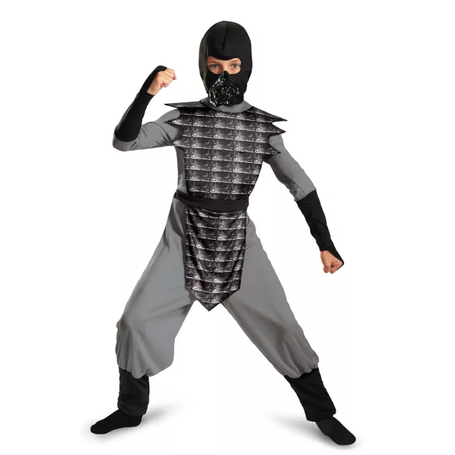 Stay hidden on Halloween and attack at precisely the right moment when you wear this Grey Evil Ninja Child Costume. Jumpsuit features an attached foam padded tunic and attached apron, complete with a hood and detachable mouth piece.