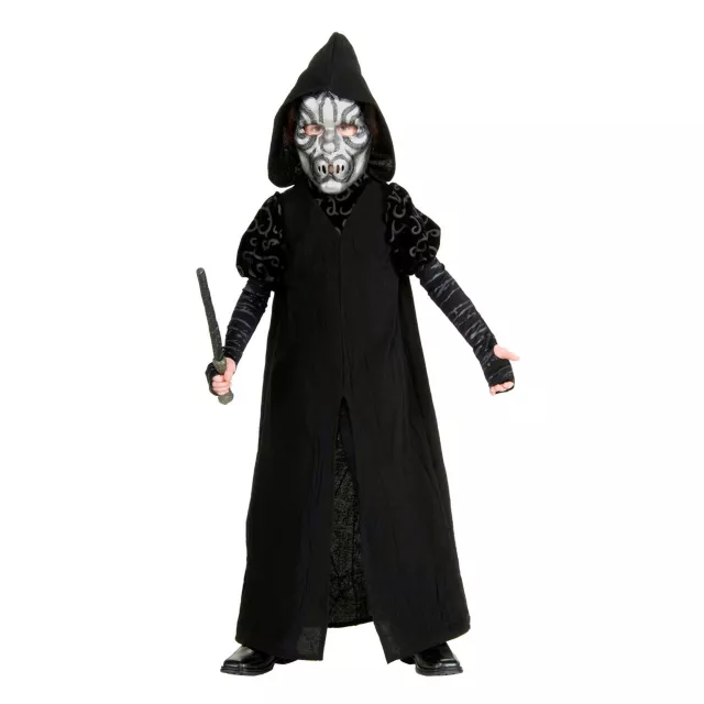 Join the legions of Lord Voldemort when you wear this officially licensed Harry Potter Death Eater deluxe child costume. The black, 100% polyester hooded robe of this Death Eater costume features attached printed sleeves, a shirt and a character mask.