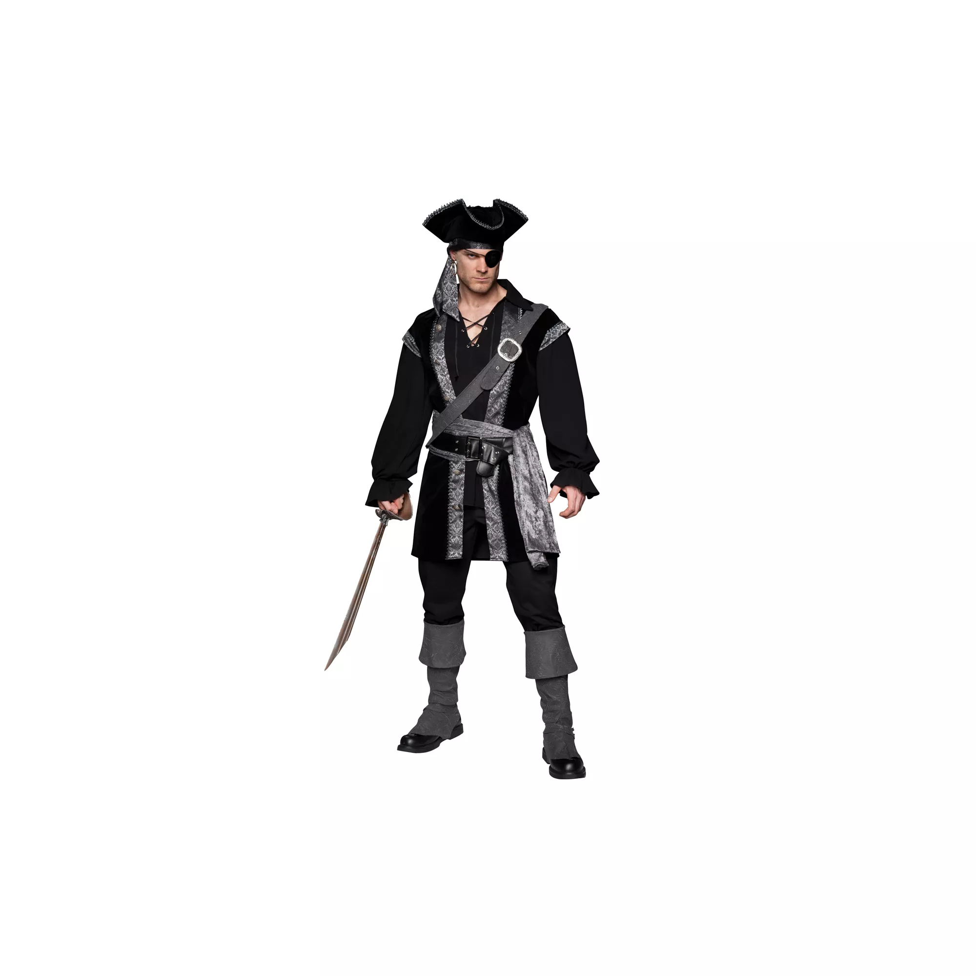 Sail around the world and discover the treasures that await you in this High Seas Rogue Adult Mens Costume. The flocked velvet vest features metallic trim, complete with gauze shirt, faux leather hat, sash, faux leather boot covers, pleather chest strap and belt.