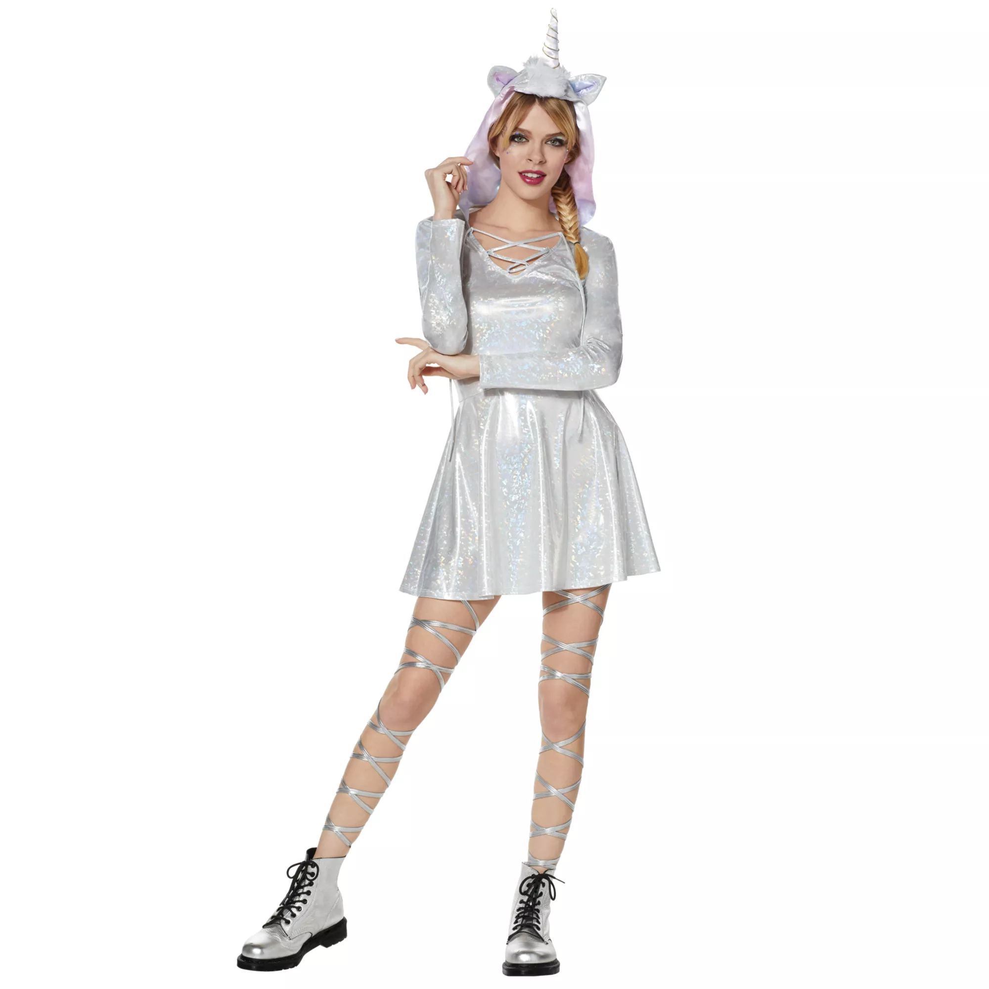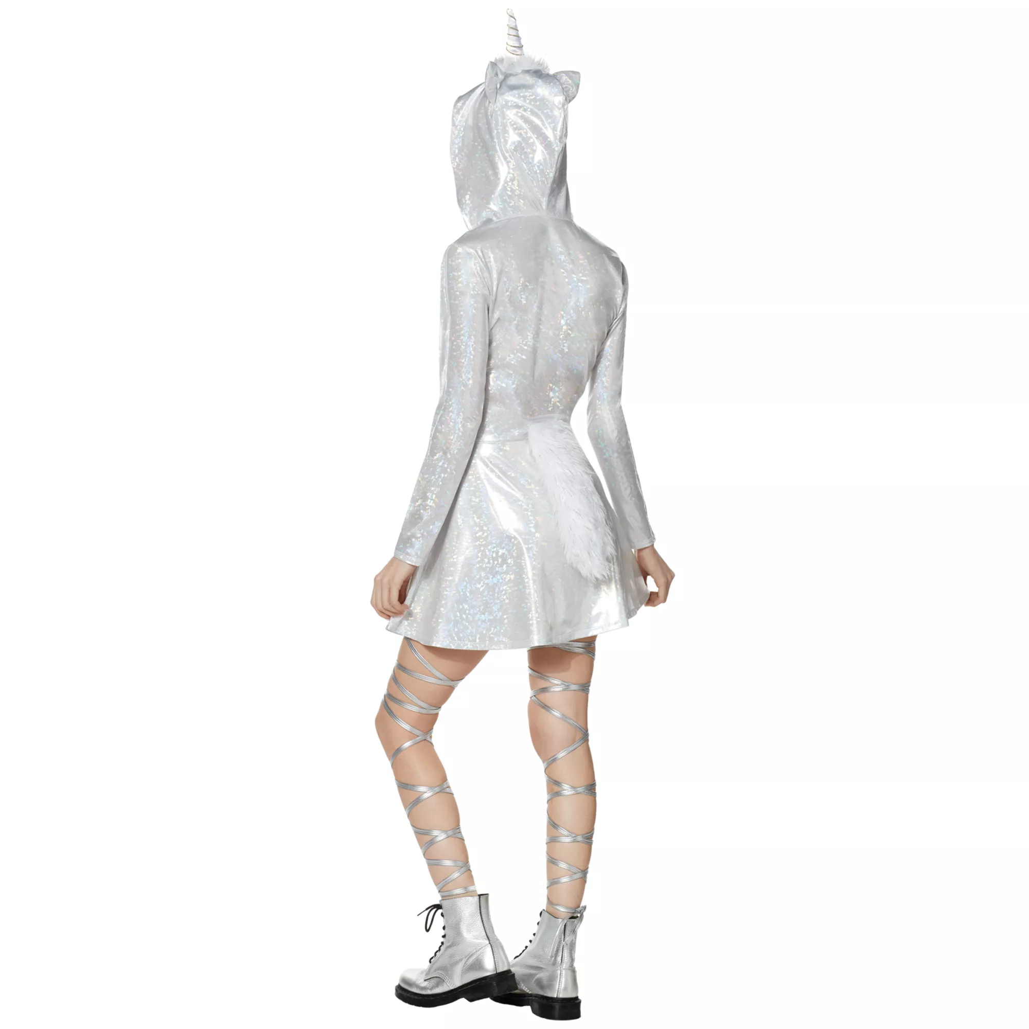 Turn yourself into a magical creature when you slip into this iridescent hooded unicorn dress. This long sleeve, v-neck dress is comfortable and cozy for every Halloween activity. Flip up the 3D hood with attached tail and let the attached faux fur tail add even more character to your look.