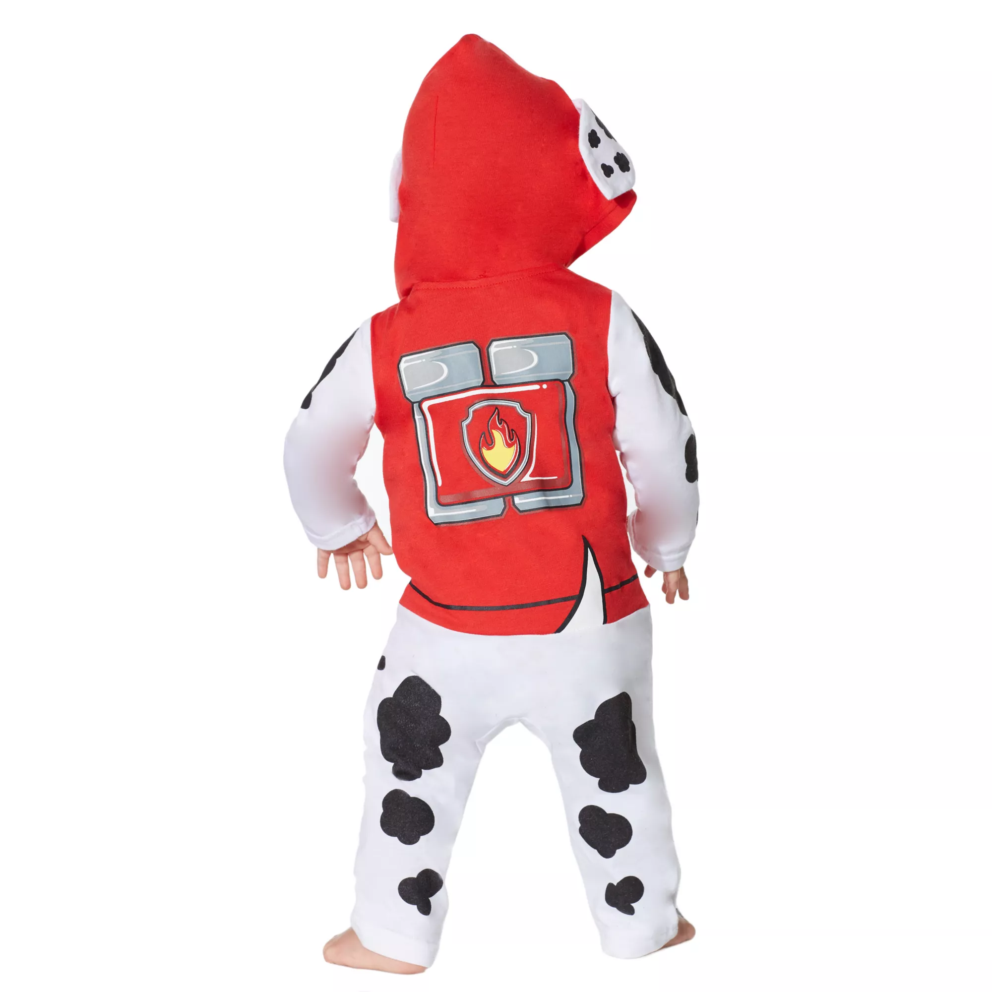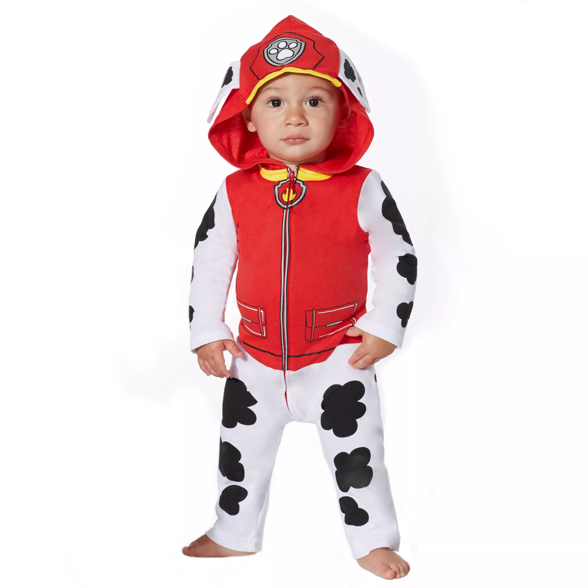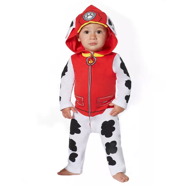 Your little one will save the day in comfort and style with this Marshall one piece costume! The one piece zip up jumpsuit features graphic detail of Marshall's fire engine red shirt, and spotted fur. Attached hood features ears that will complete the puppy look.