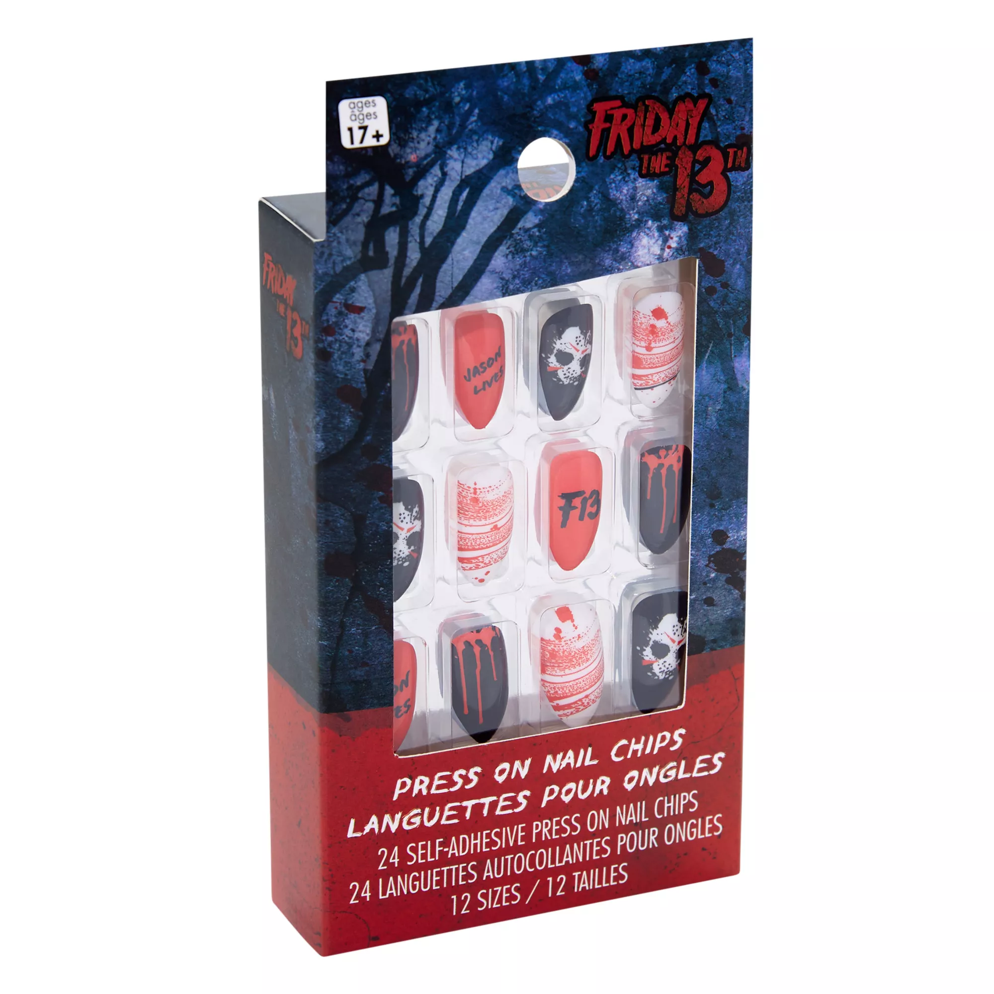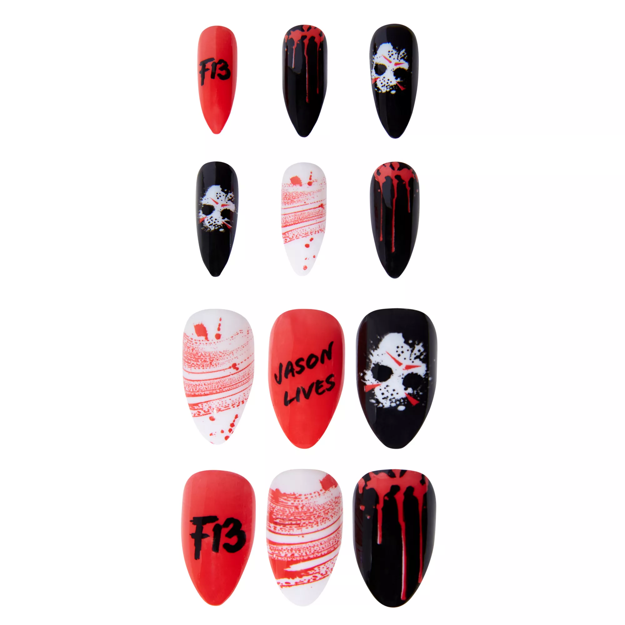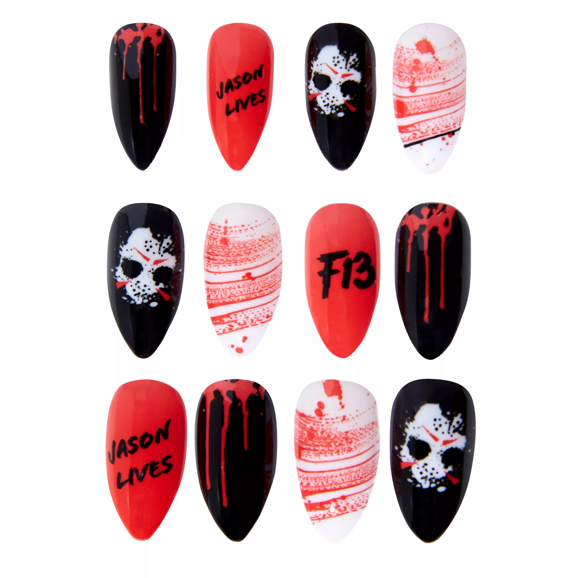 Show off your favorite horror movie with these official Friday the 13th Jason Voorhees Press On Nails! These fun white, red and black press on nails feature Jason's mask and dripping blood for the perfect scary look.