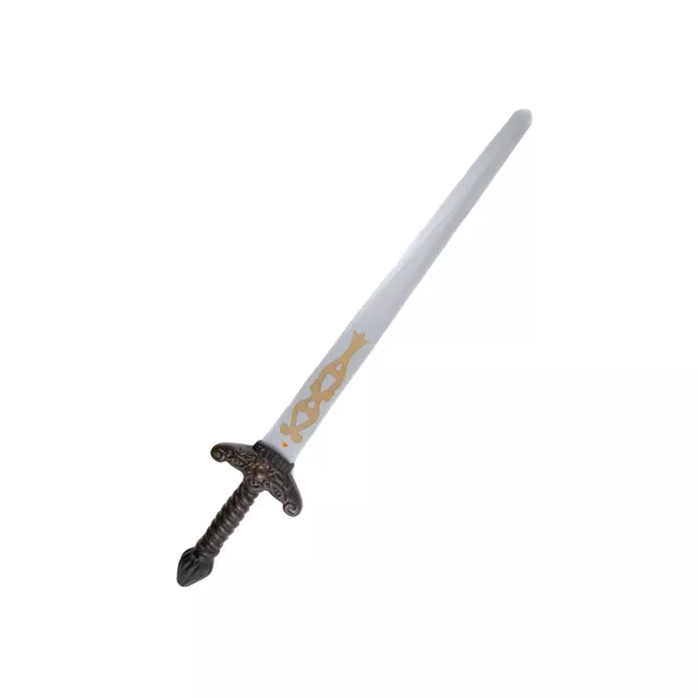 En garde! This is an amazing, two-handed wooden sword that bears an elegant golden design detail on the extra-large blade and a stunning carved handle. It's great for a sknight costume, warrior costume, or other period costume.