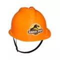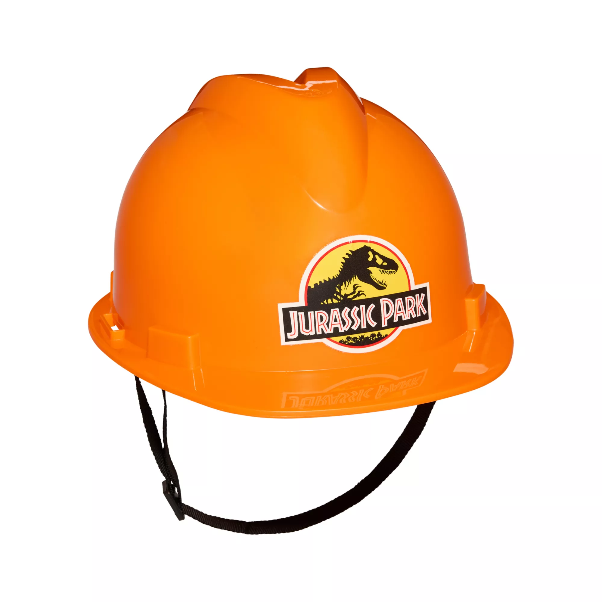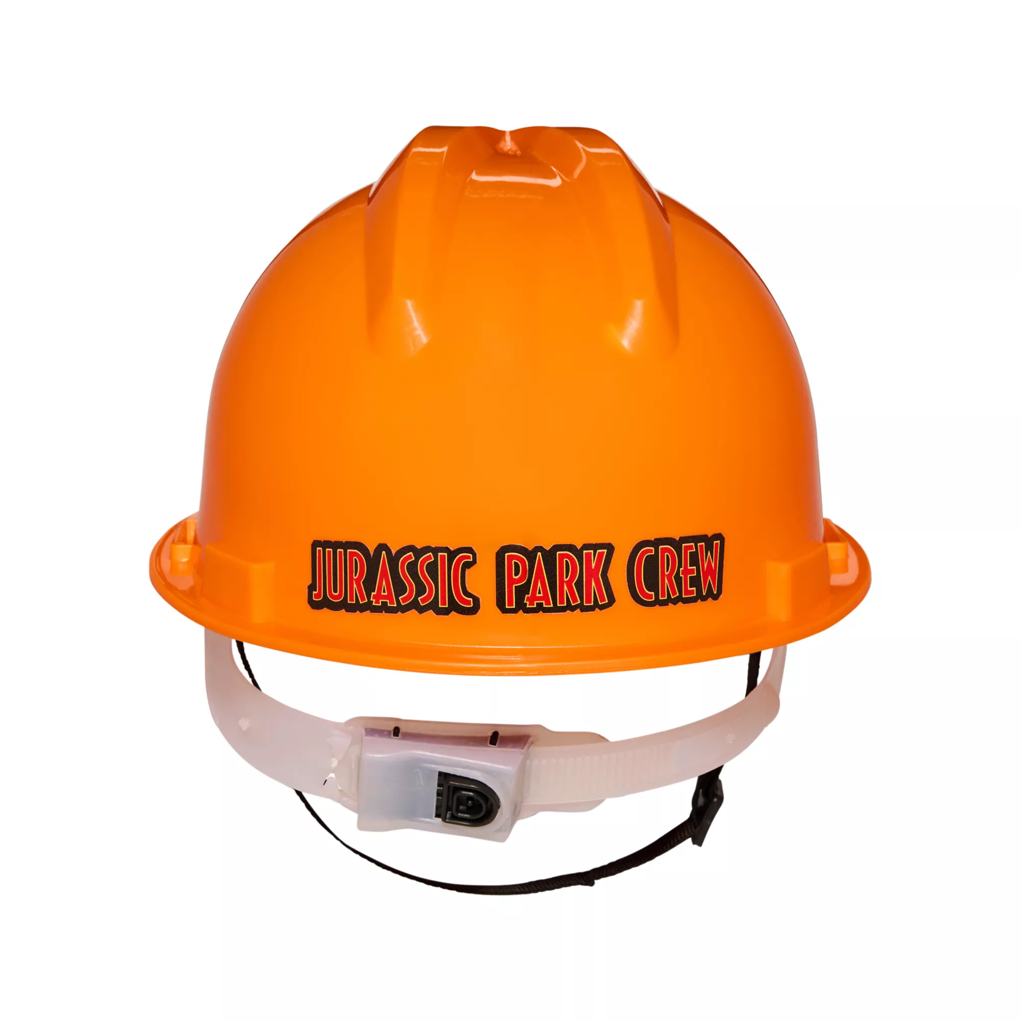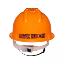 Complete your Jurassic Park-inspired costume with this bright orange hard hat! This hard hat features an authentic dinosaur decal on the front, a "Jurassic Park Crew" decal on the back, and a chin strap with a secure buckle closure.