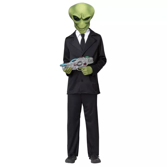 Have an out of this world Halloween adventure when you wear this innovative Alien Agent child costume. The green half mask of this alien costume comes complete with a black jacket, matching pants, a white dickey and a black tie.