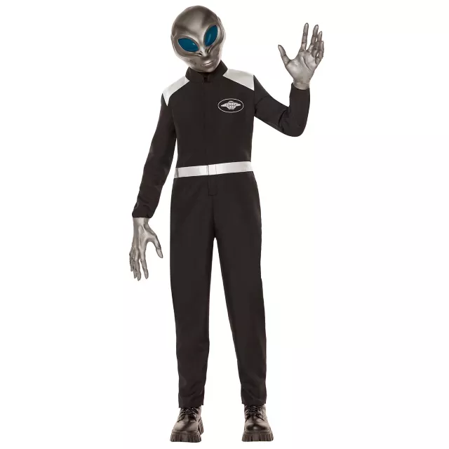 Invade the party in this kids' alien jumpsuit costume! This out-of-this-world costume features a black jumpsuit with an embroidered spacecraft chest emblem and silver shoulder and belt accents. A chilling mask with unnaturally large blue eyes and a pair of oversized hands complete this alien style.