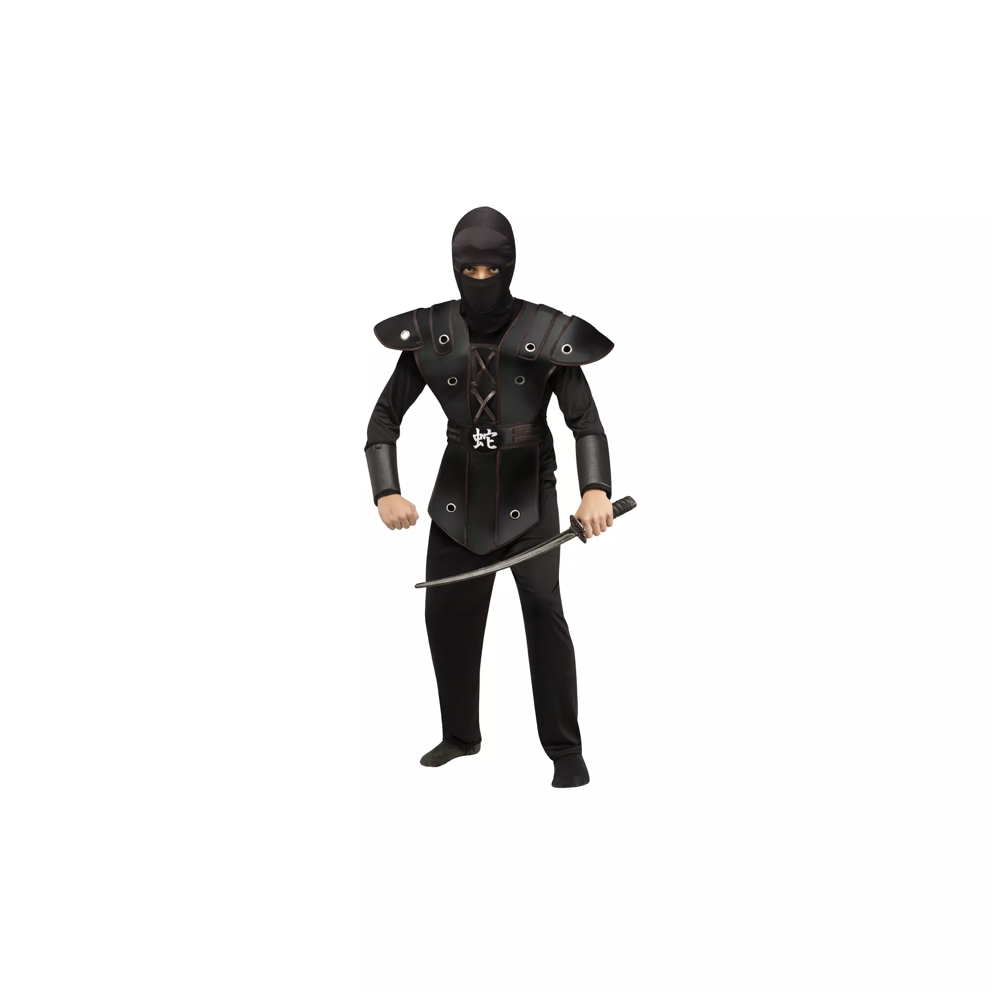 Get out of the shadows and into the fight when you wear the Ninja Warrior Boys Costume. This black shirt comes complete with matching pants, a tunic with an attached belt, epaulets, arm guards and a hood with face mask.