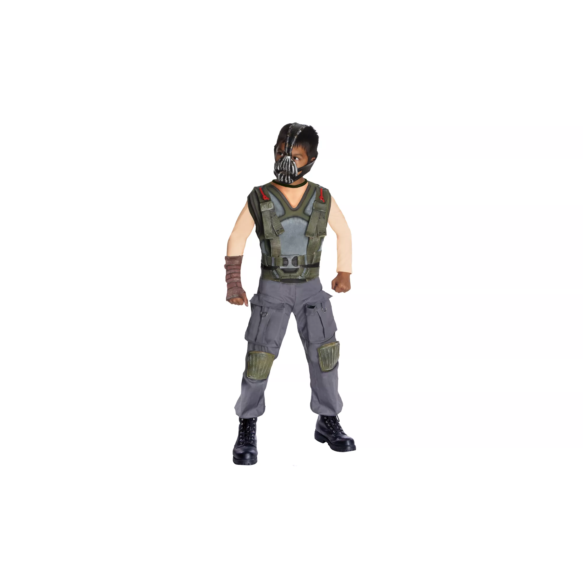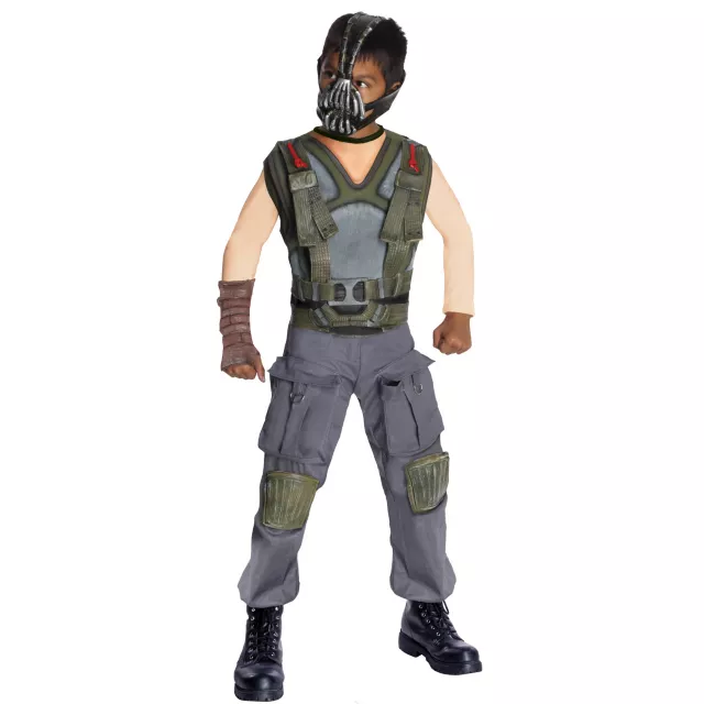 Create havoc on Halloween when you wear this officially licensed Batman Dark Knight Rises Bane deluxe child costume. The gray, beige and green jumpsuit features a muscle chest and comes complete with character face mask, molded belt and gauntlet.
