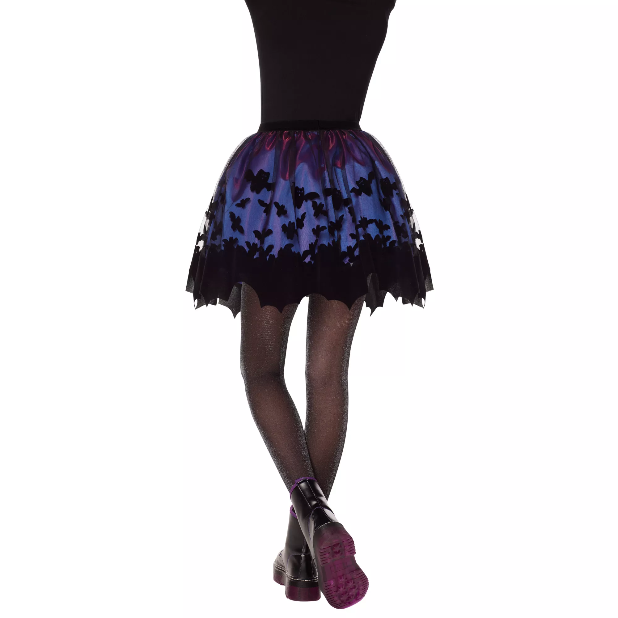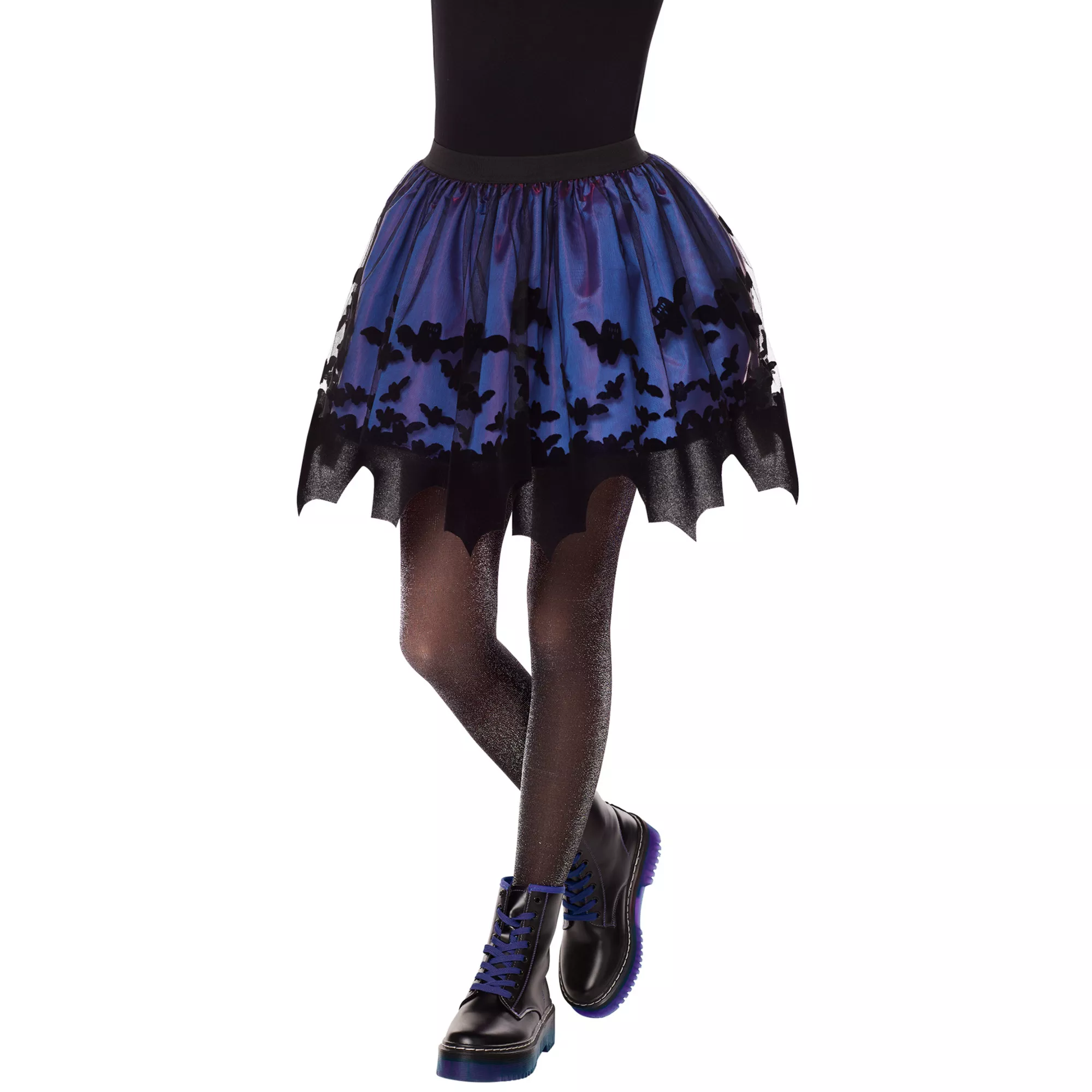 Make your Halloween look memorable with this kids bat skirt. This stylish purple and black skirt has a top layer featuring flying bats that's perfect for trick-or-treating or any Halloween party.