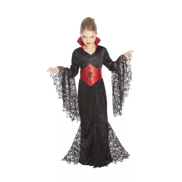 You'll have to find a way to quench your thirst when you decide to wear this Black Lace Vampira Girls Costume. The black and red corset dress features web-like sleeves so you can trap your prey with ease!