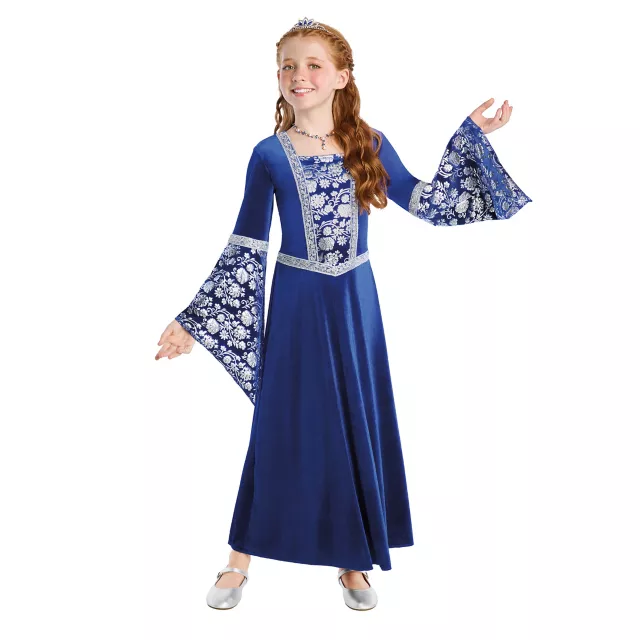 Let your imagination take you to the Middle Ages in this Kids' Blue Medieval Costume. This costume includes a rich blue dress with bell sleeves, a traditional square neckline, and delicate floral accents. A matching tiara adds the perfect finishing touch to this enchanting style.