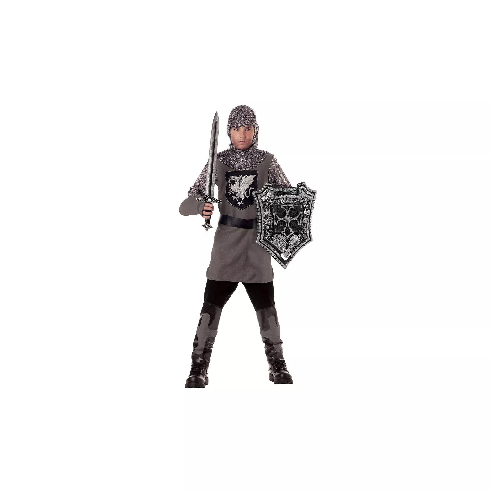 You'll have nothing to fear on Halloween in this Brave Knight Child Costume! Surrender to no one wearing this tunic with classic dragon detail, hood with chain mail appearance, gauntlets, boot tops, and belt with the exception of a fire breathing dragon.