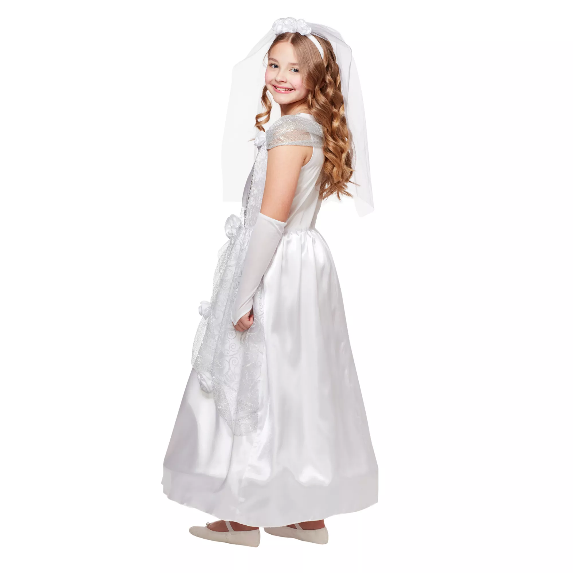Look ready to walk down the aisle in this beautiful bride costume! This costume is all white with silver accents, and includes everything you need to become a beautiful blushing bride!