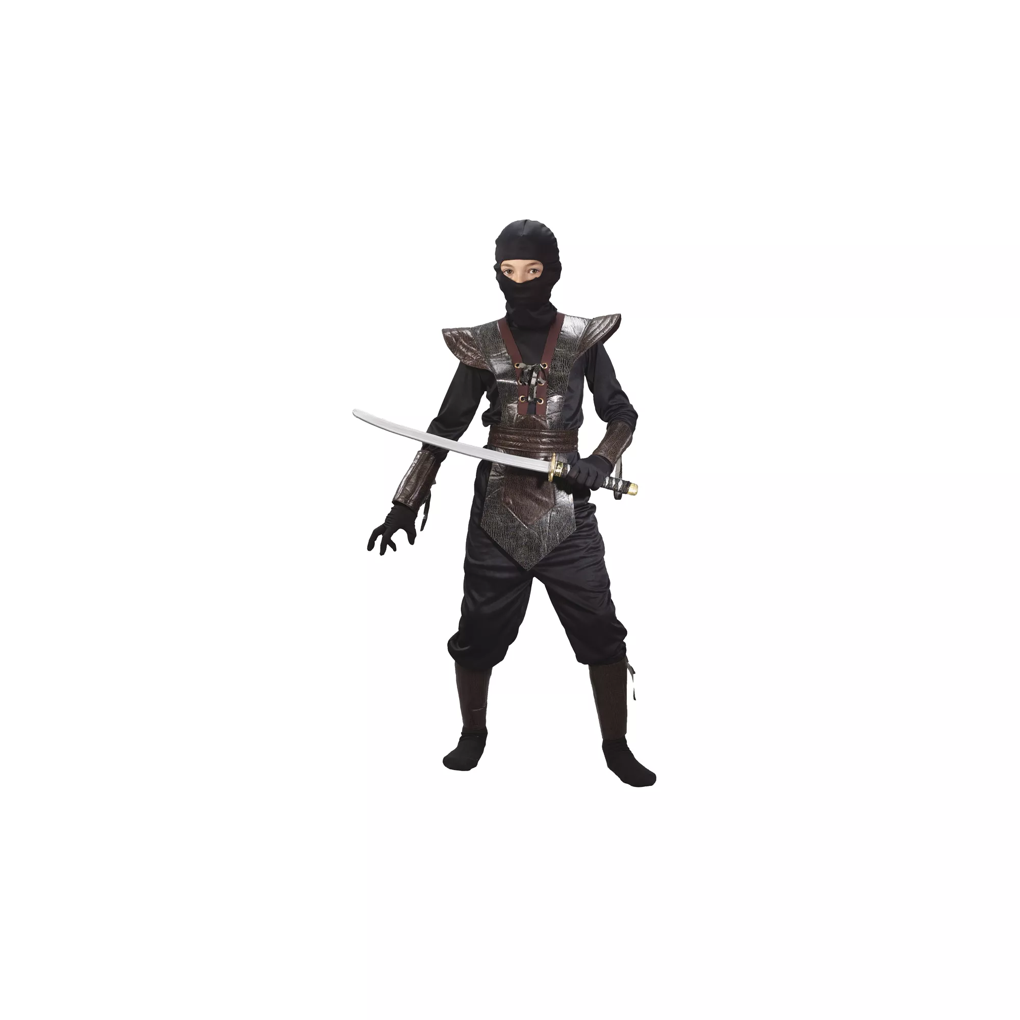 Cover yourself in darkness on Halloween when you wear this Ninja Brown Leather boys costume. The black, long-sleeved pullover top comes complete with black pants, black hood, distressed faux leather armor tunic with lace-up front, matching belt, wrist guards, ankle guards and ties.