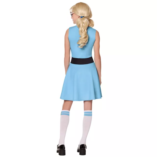 Join the Powerpuff Girls in their dazzling adventures when you wear this baby blue Bubbles costume! This costume includes a blue dress with an attached black belt and a Bubbles logo on the skirt, two hair accessories, bold Bubbles sunglasses, a necklace adorned with the name "Bubbles," and a pair of white and blue knee-high tights!
