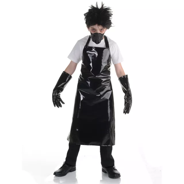 Complete your child's butcher look with this butcher apron set! The black apron, black gloves, and black mask will have your little one looking scary as ever for his night out this Halloween!