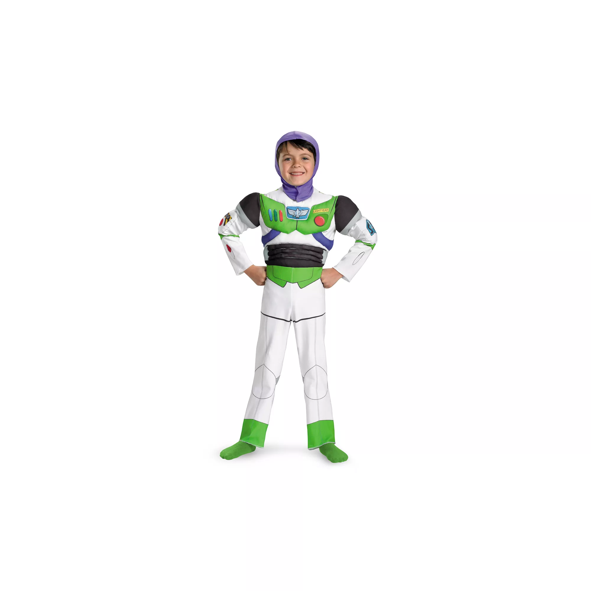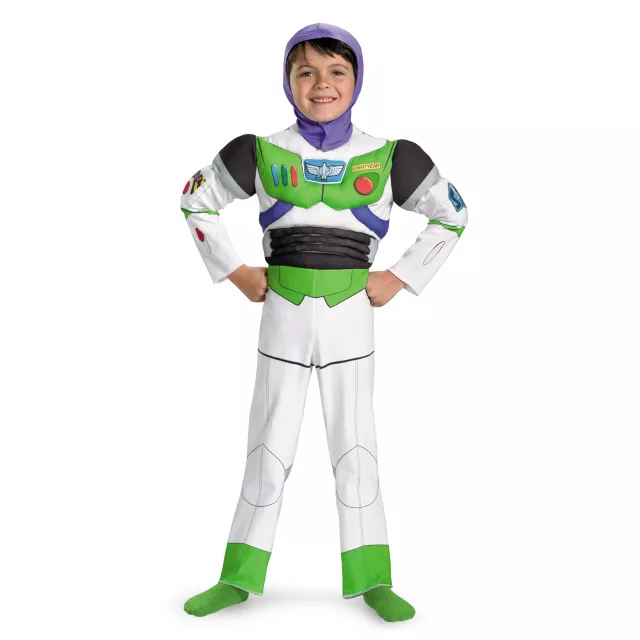 Be the Captain of the Alliance Team on Halloween when you wear this officially licensed Toy Story 3 Buzz Lightyear deluxe child costume. The printed space ranger jumpsuit if this boys costume features padded torso and arms, complete with a character hood.