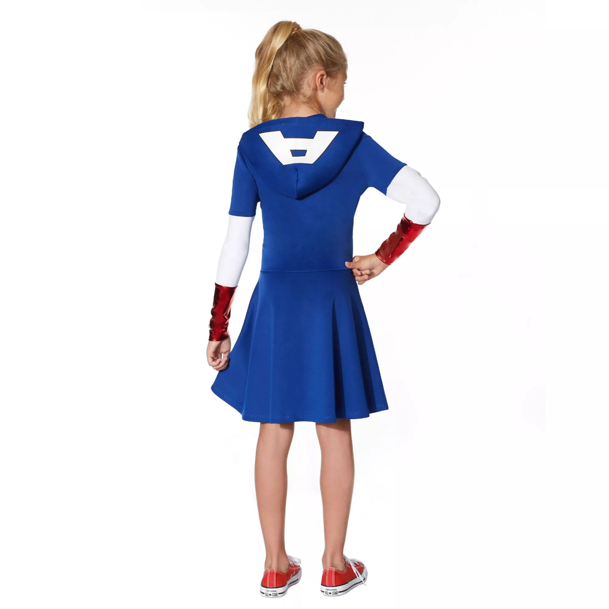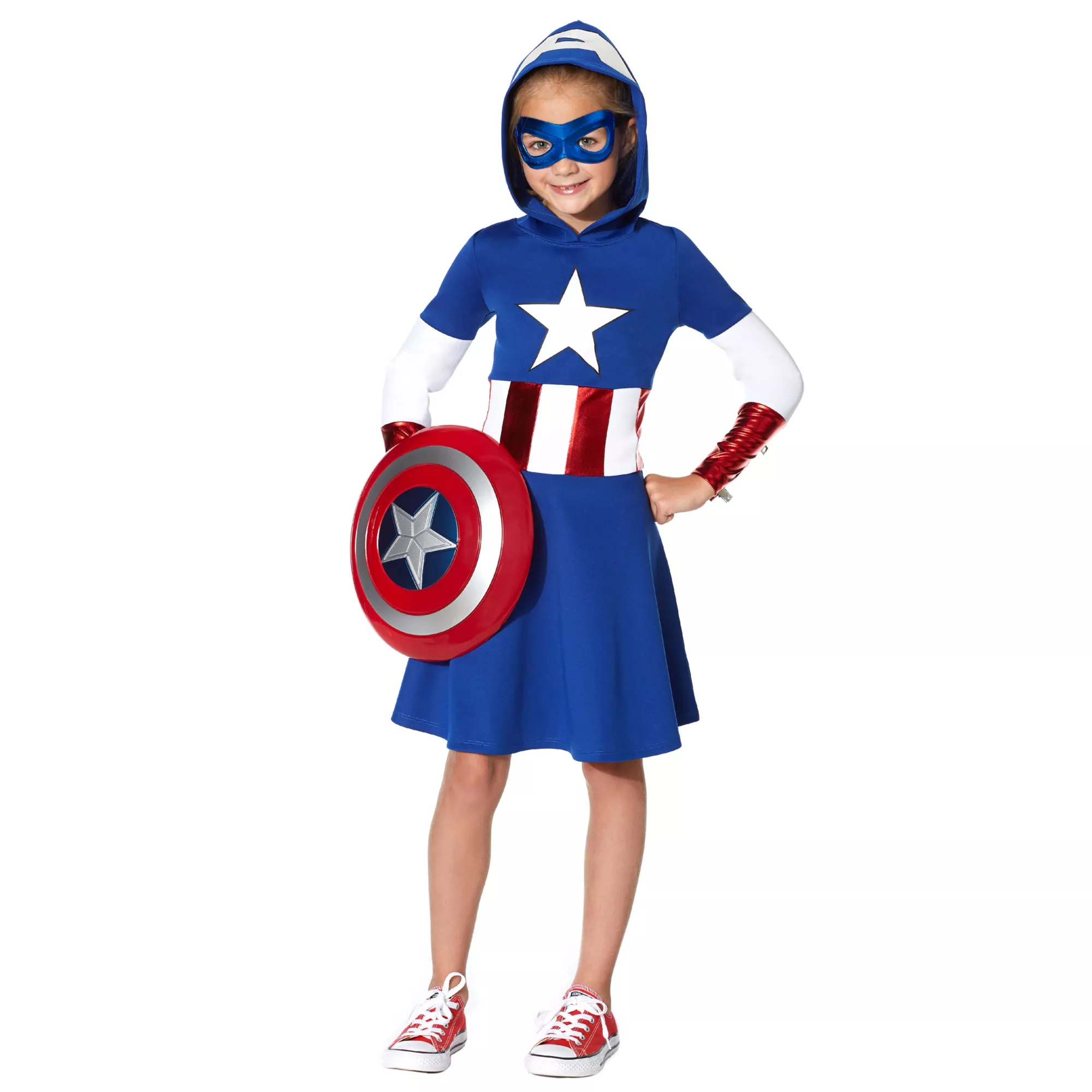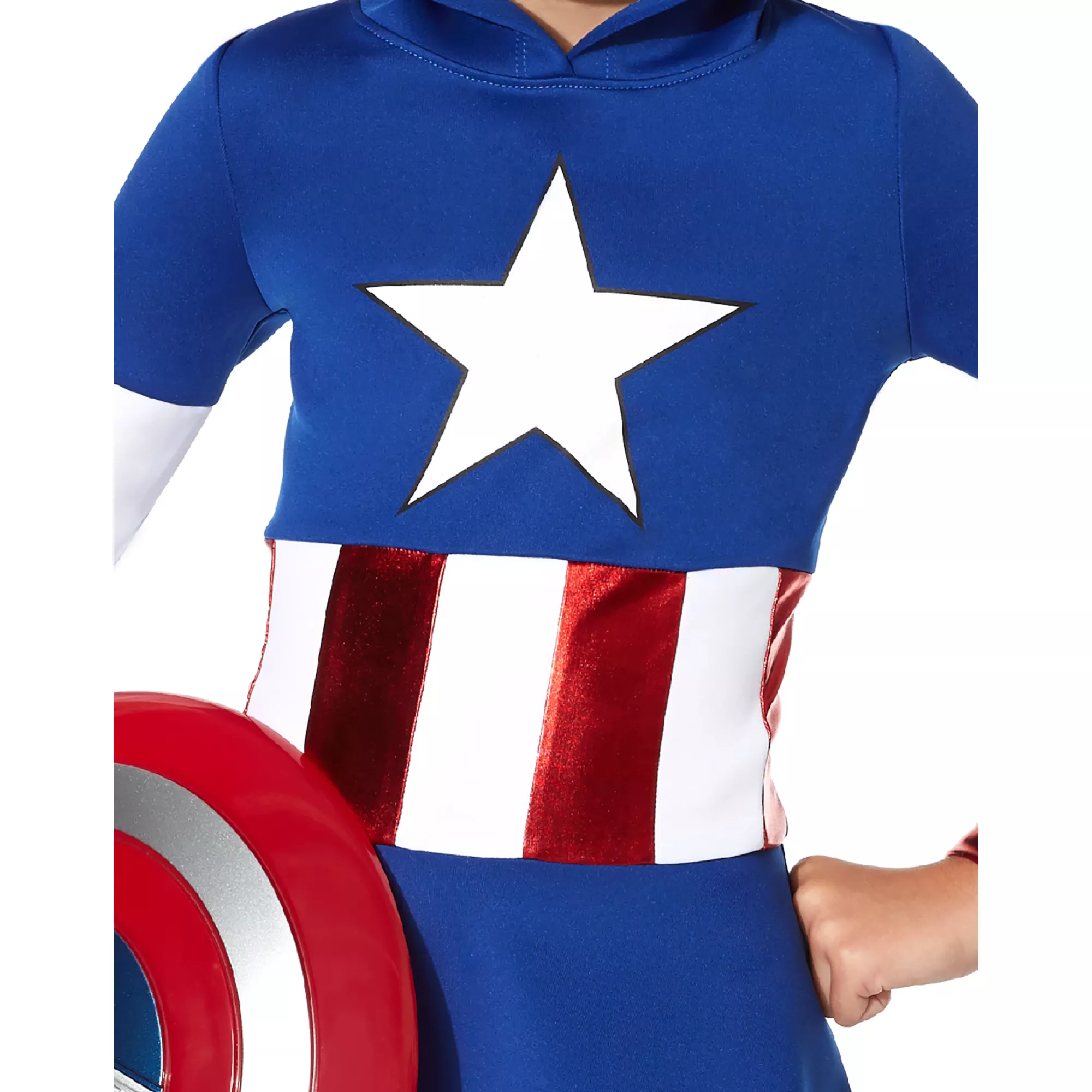 Suit up as America's first Avenger and prepare to unleash some patriotic power! This officially licensed Captain America dress will have you ready to demolish any villain who stands in your way! The look features a glitter star, shimmering red stripes, and even Cap's signature 'A' on the hood!