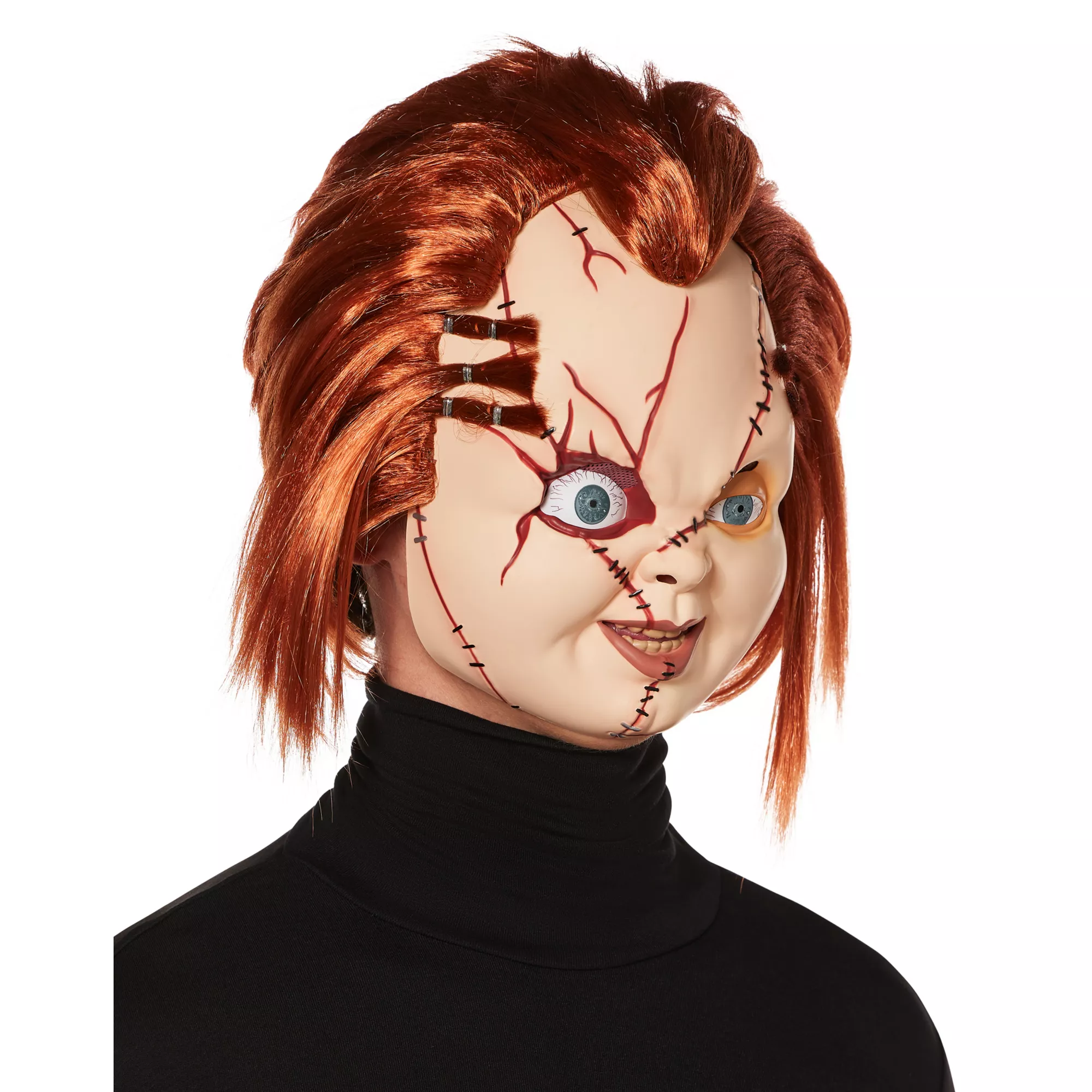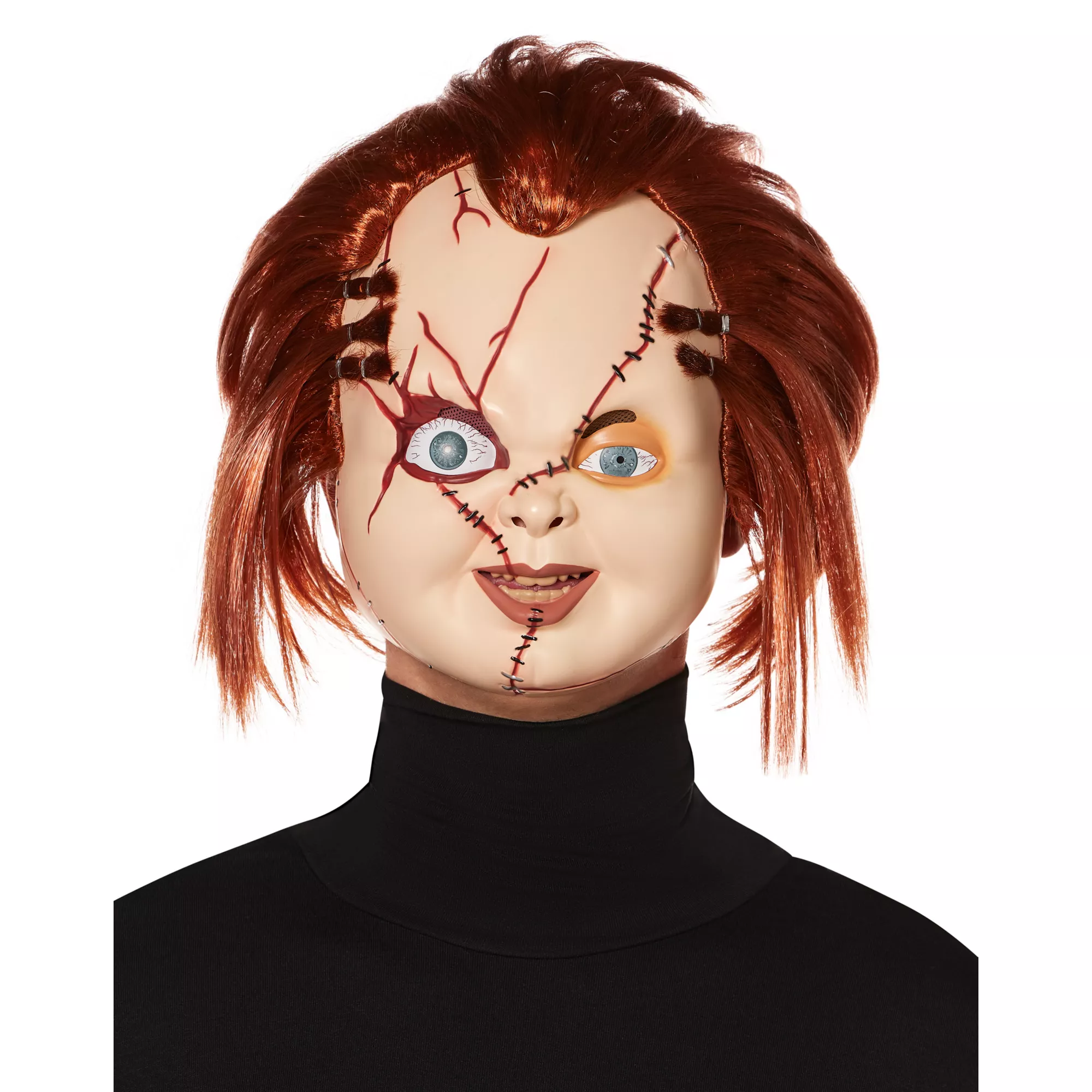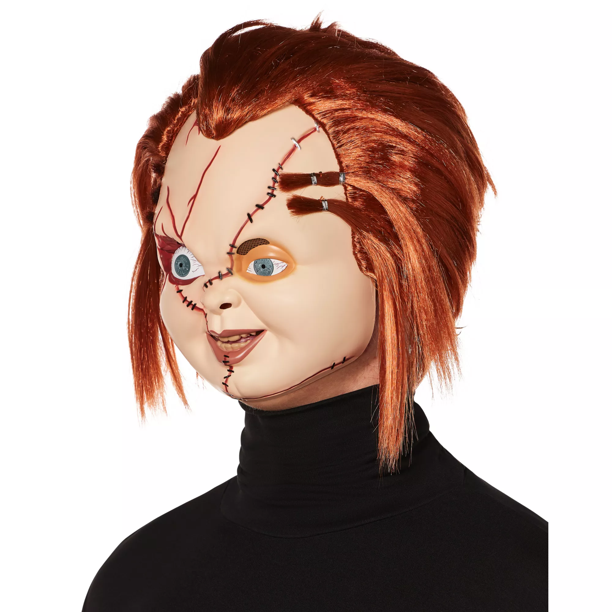 You'll be a walking Chucky doll in this full mask! This kids' Chucky mask features fiery red hair and bone-chilling facial scars. An elastic band keeps this scary mask secure while you're up to no good.