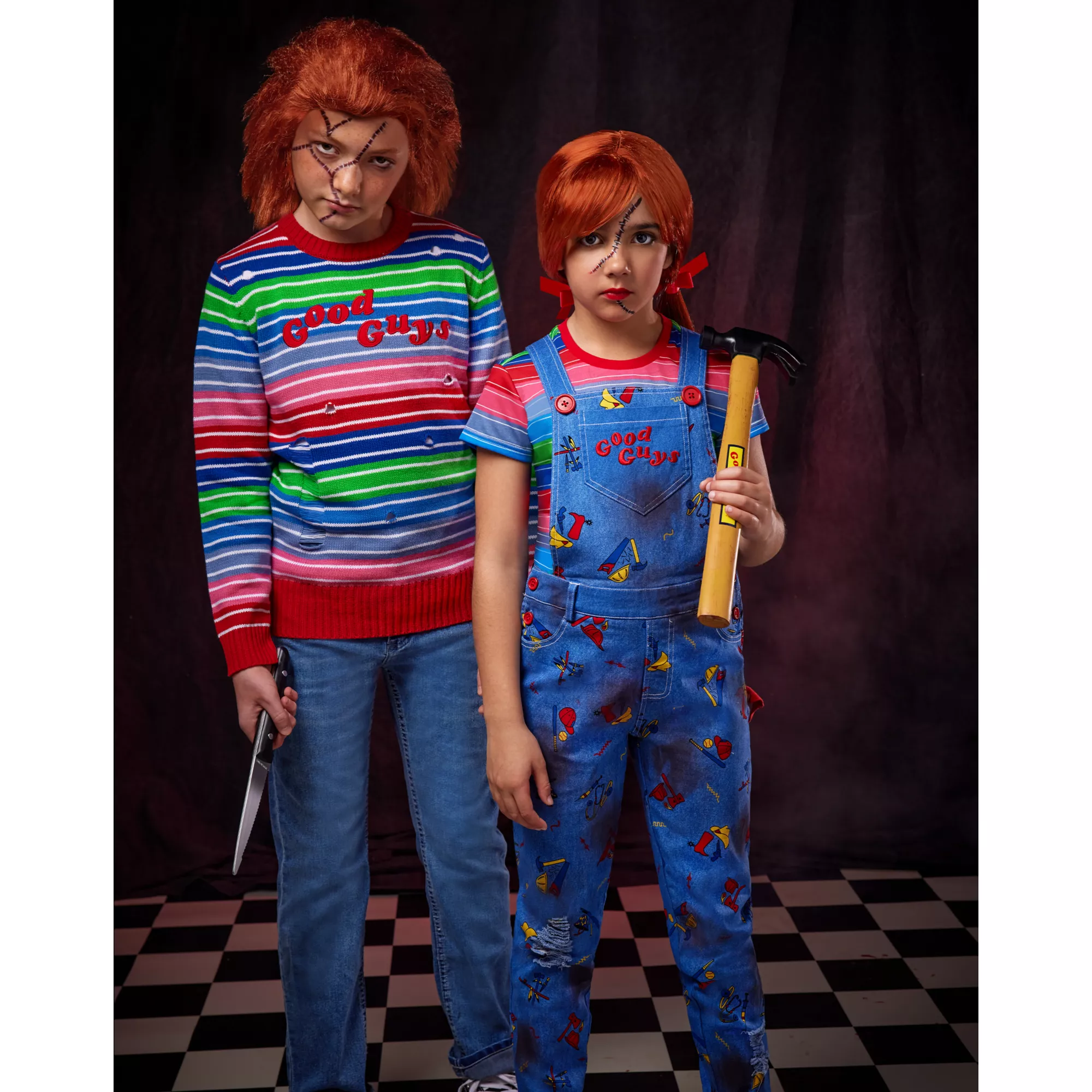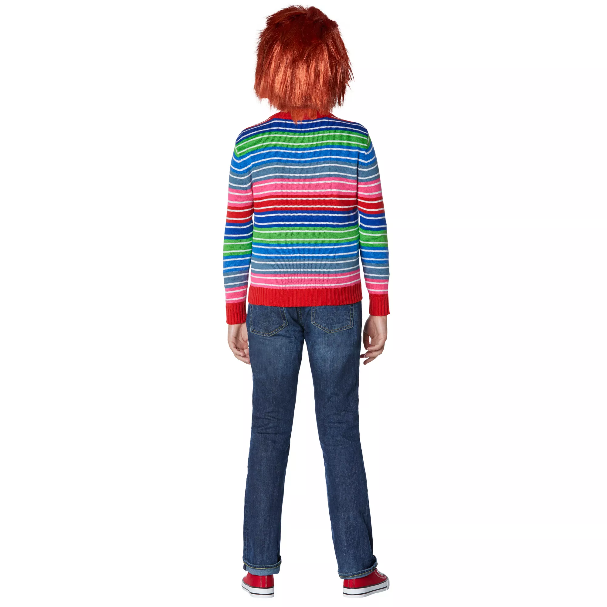 Join Chucky's frightening fun with this officially licensed costume kit! This colorful costume kit features Chucky's signature "Good Guys" sweater and a menacing knife prop. This striped pullover sweater includes holes and tears that tell an intriguing story!