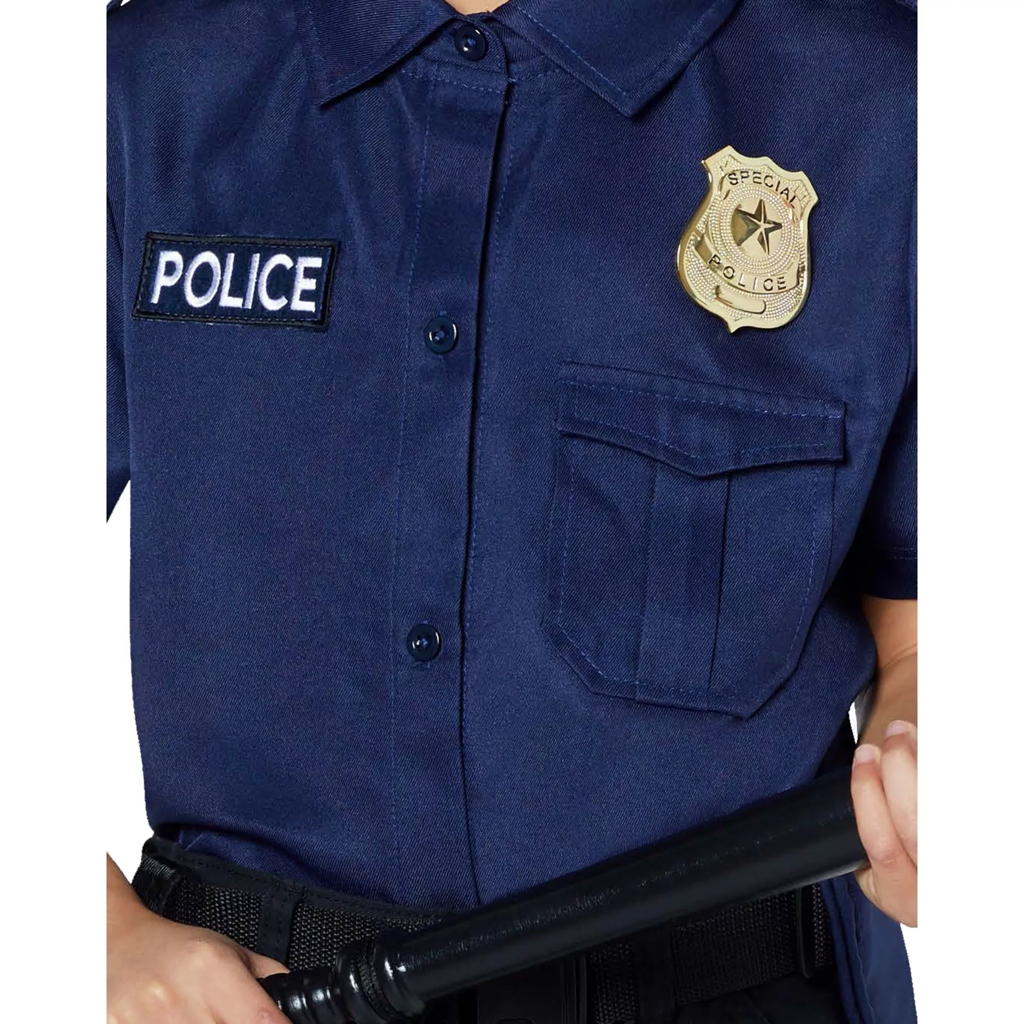 Let your little one serve and protect this Halloween! This navy blue button down shirt, stiched badge, handcuffs and police hat are everything he'll need to keep the neighborhood safe!