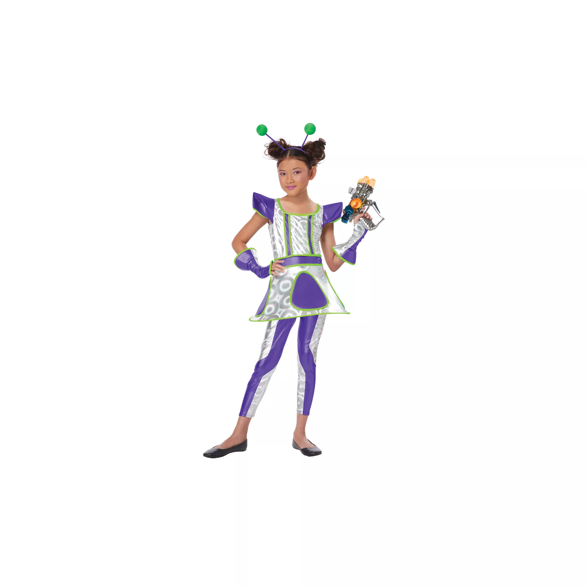 Everyone will be jealous of your crazy out of this world look when you wear this Cosmic Cutie Girls Costume. Tell them all about what it's like to live among the stars in this shiny silver metallic dress with pointed shoulders and purple and green detail, matching leggings, gloves and antennae.