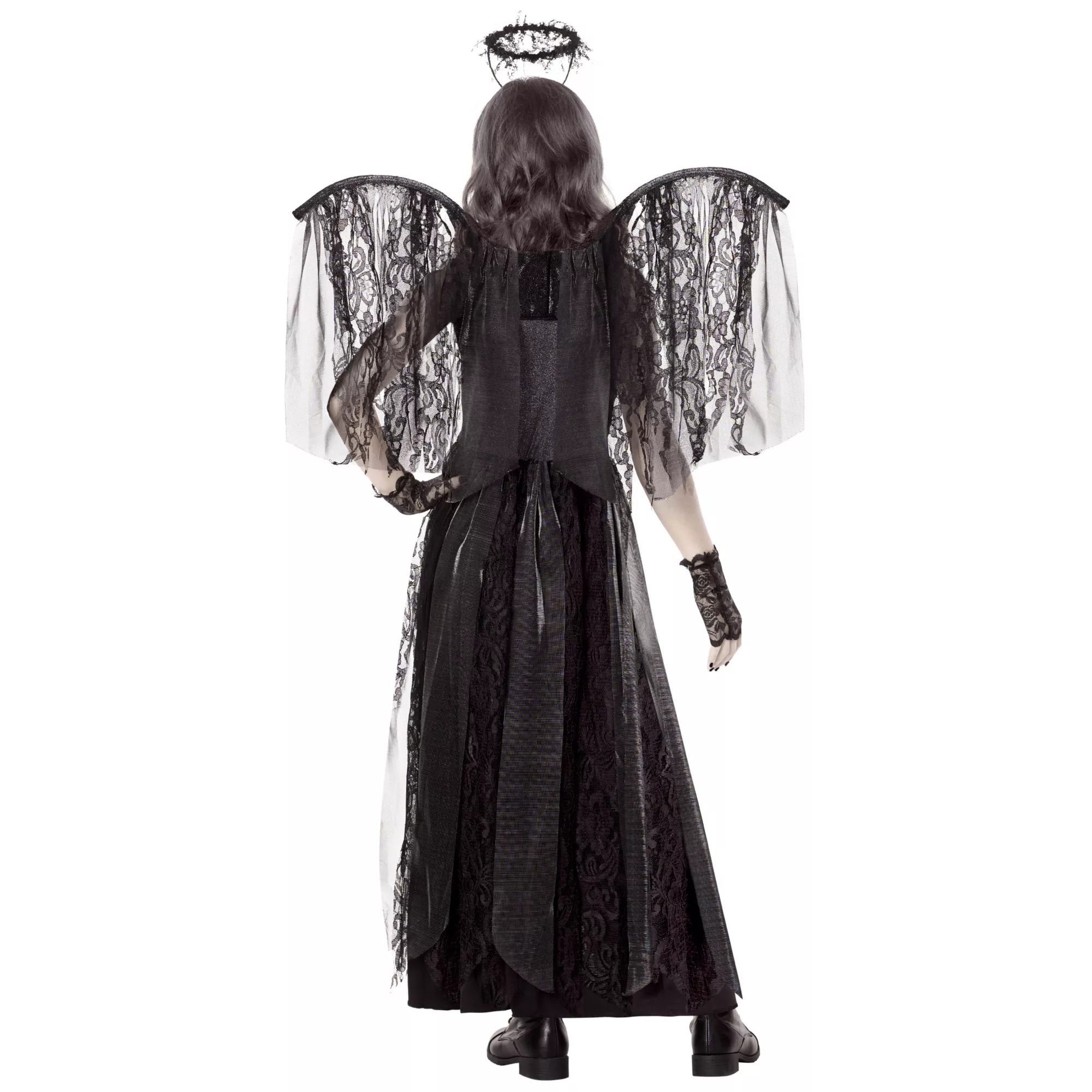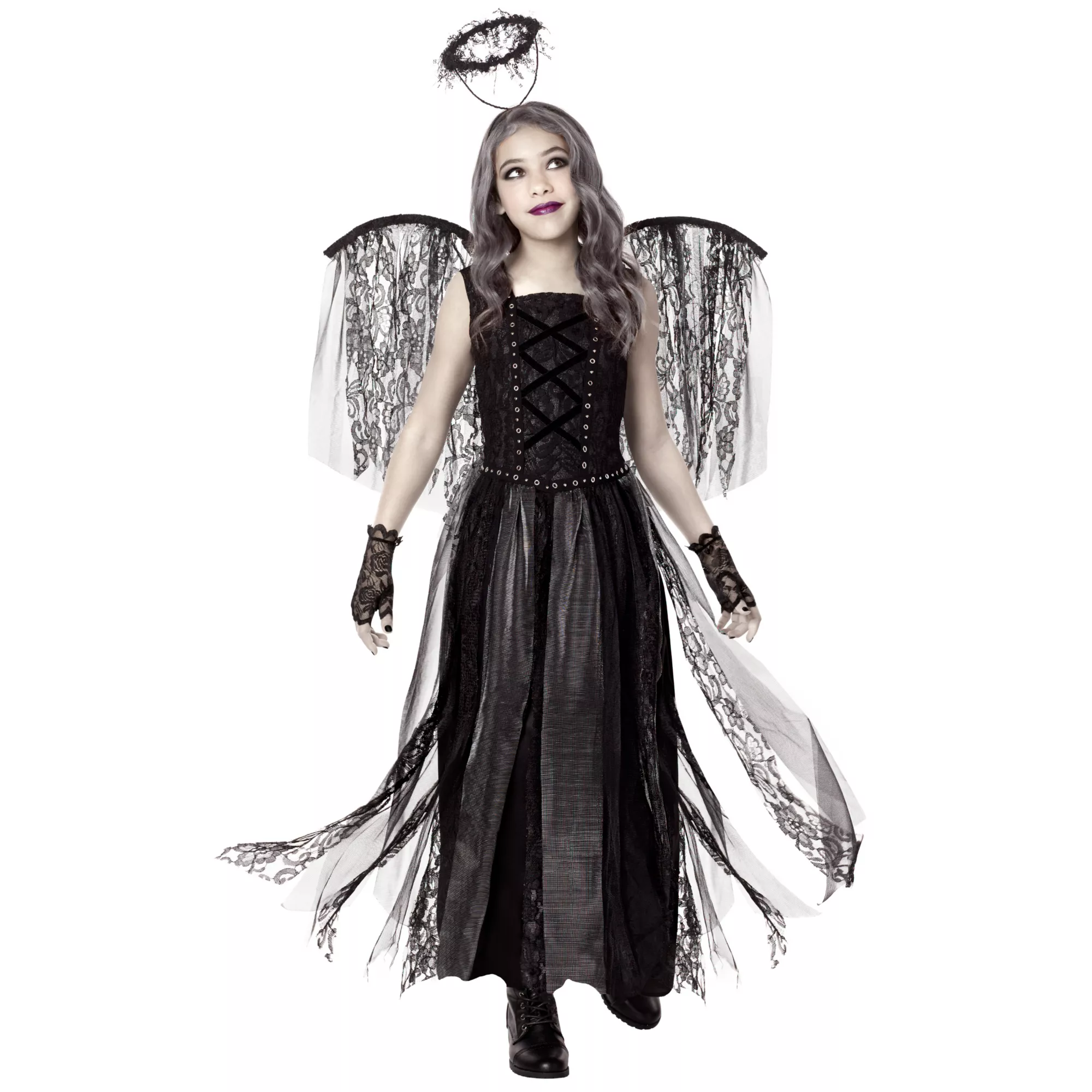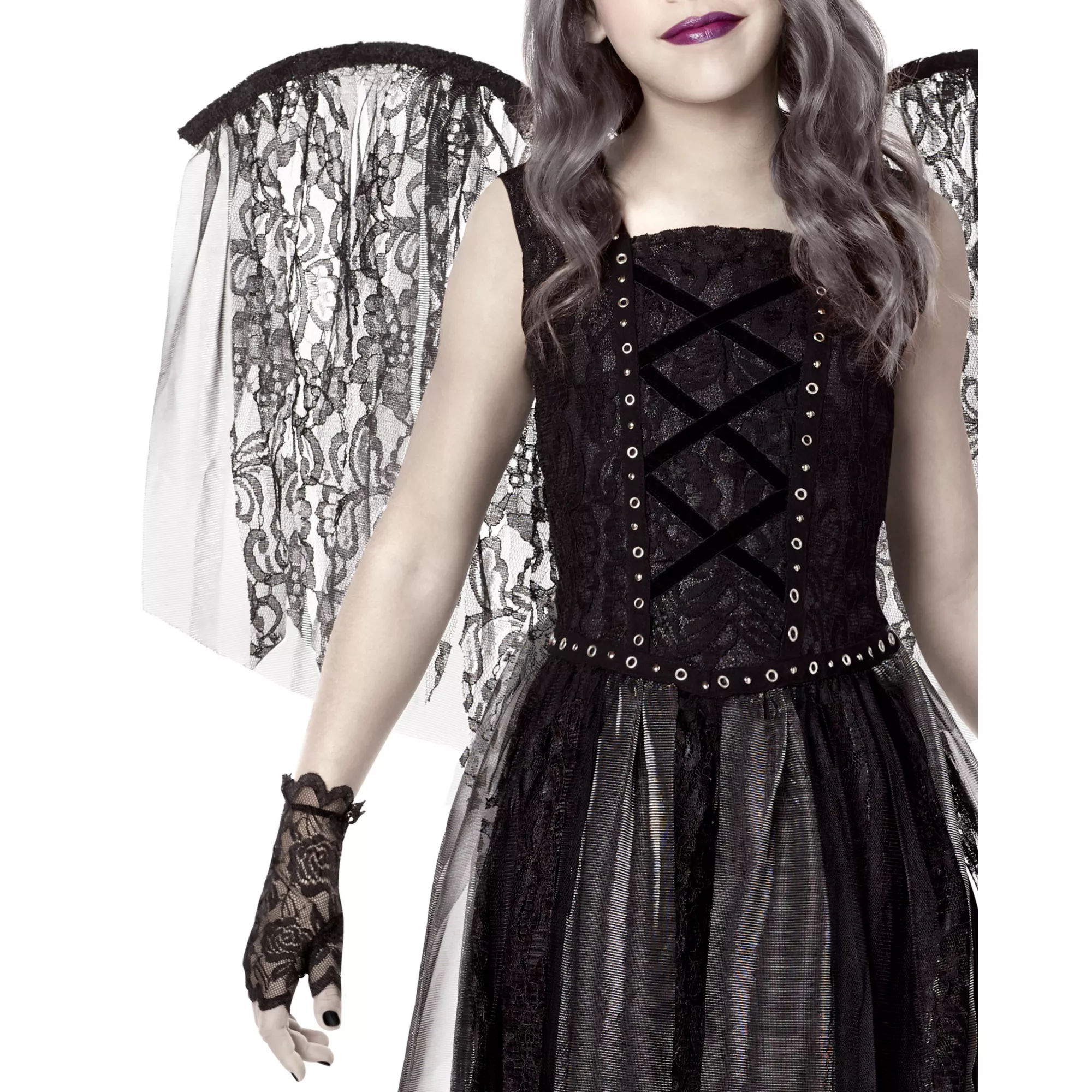 Float through the night air in this shadowy and beautiful Kids Dark Angel Costume! This long, dark, lace-detailed dress pairs angelically well with falling lace wings and delicate lace fingerless gloves. Complete the elegant look with a black halo headband.