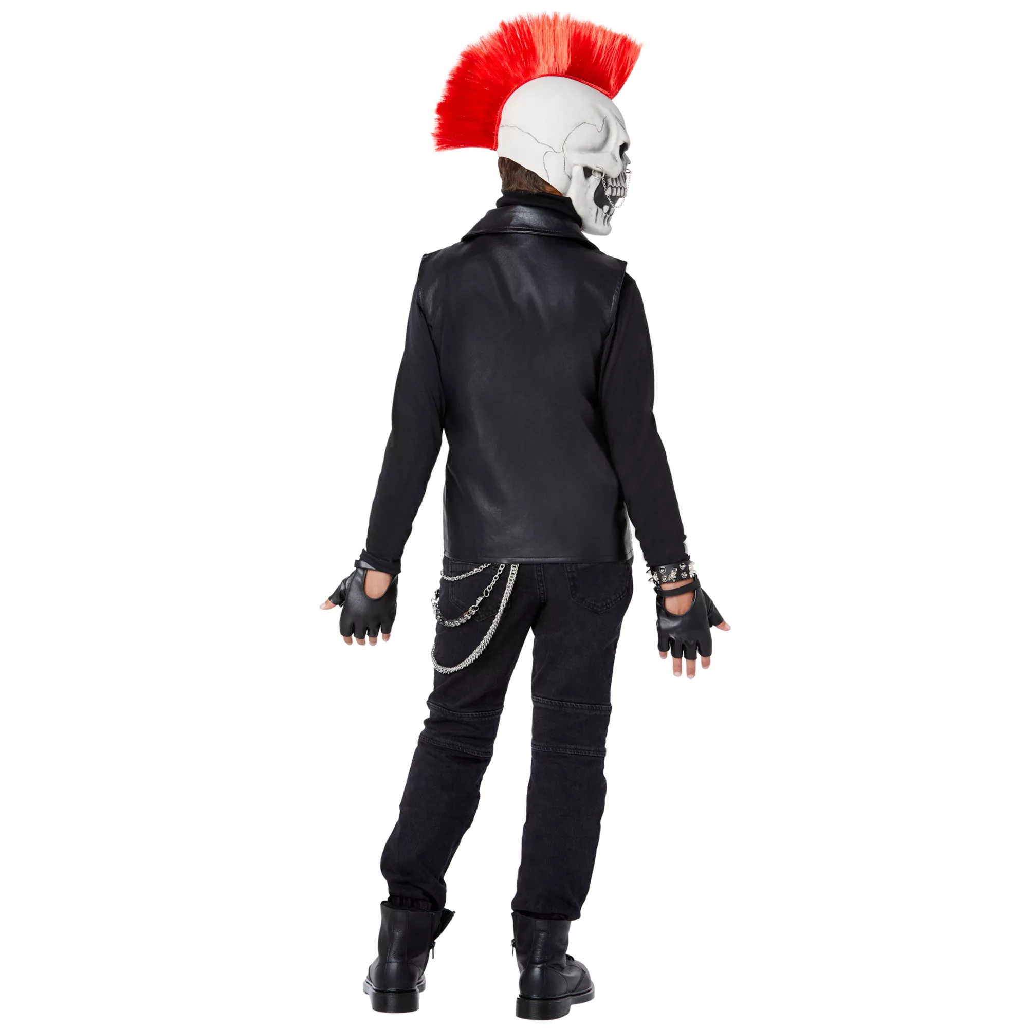 You'll look bad to the bone this Halloween when you wear this Kids Dark Rebel Punk Skeleton Costume. This costume includes a faux leather vest, a long-sleeved shirt with bone print, and a skull mask, making you look like the hardest rocking skeleton in the neighborhood!
