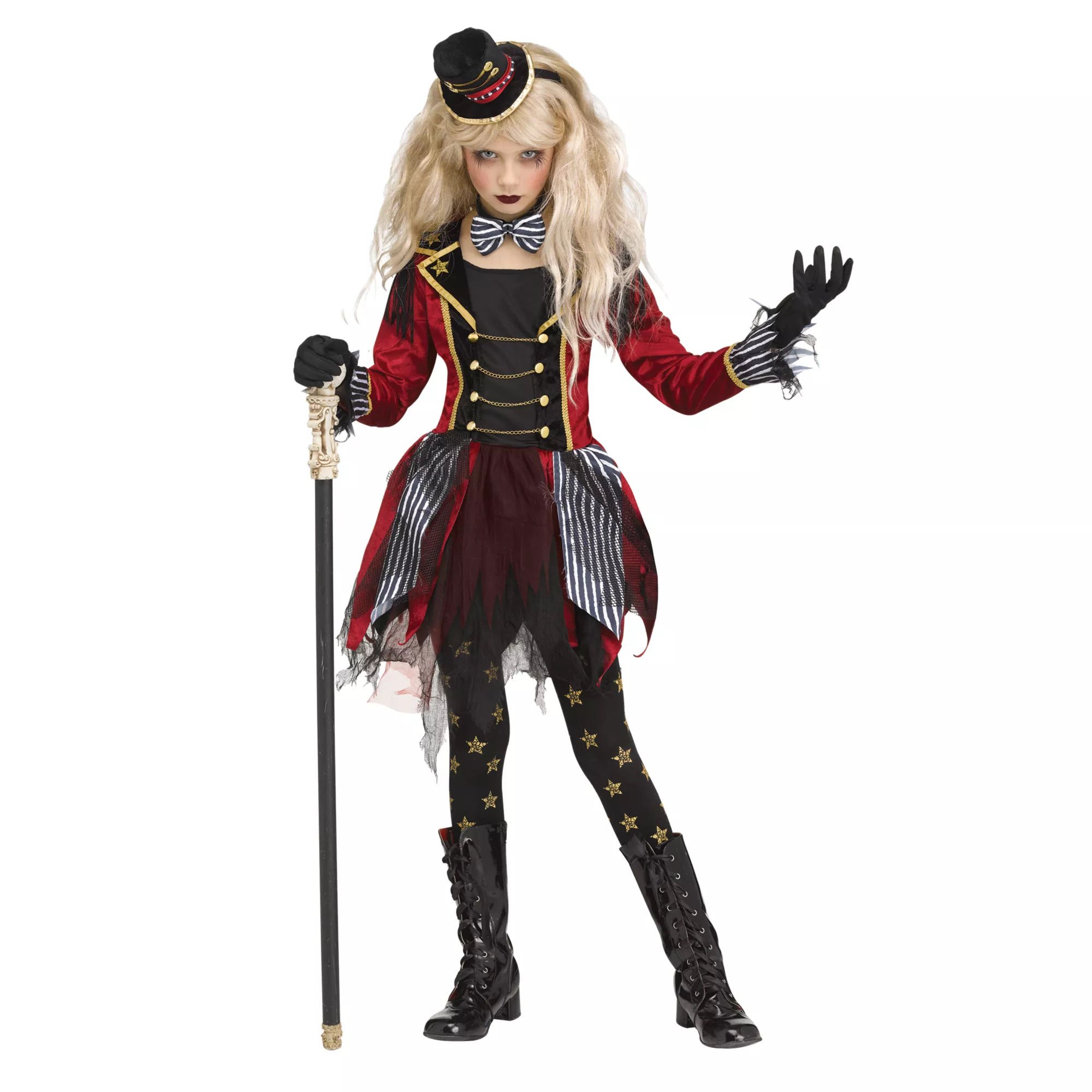 Come one, come all! Become the spooky ringmaster you've always dreamed of with this stylish Halloween costume! This detailed dress comes complete with a striped bow tie, a fascinator headband, footless tights with star detail and glovelettes for a completed look! The circus has no idea what they're in for this year.