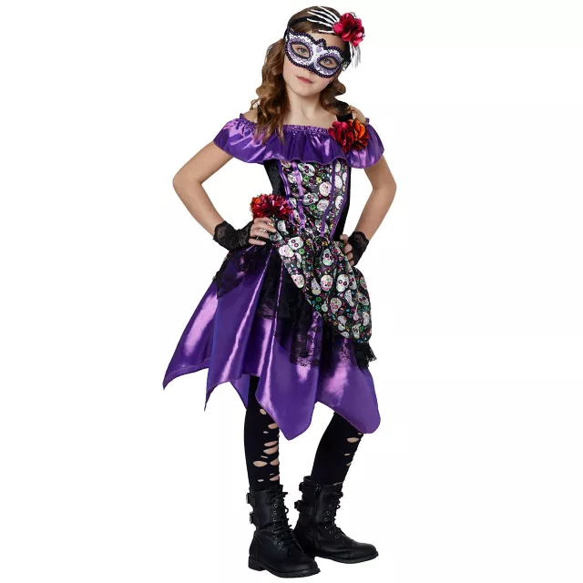 Let your little one celebrate Day of the Dead on Halloween with this beautiful Day of the Dead dress costume! The colorful sugar skull detail, velvet material, and off the shoulder sleeves are perfect for every little girl! Lace detail matches the included gloves and headband for a put together look that is unlike the rest!