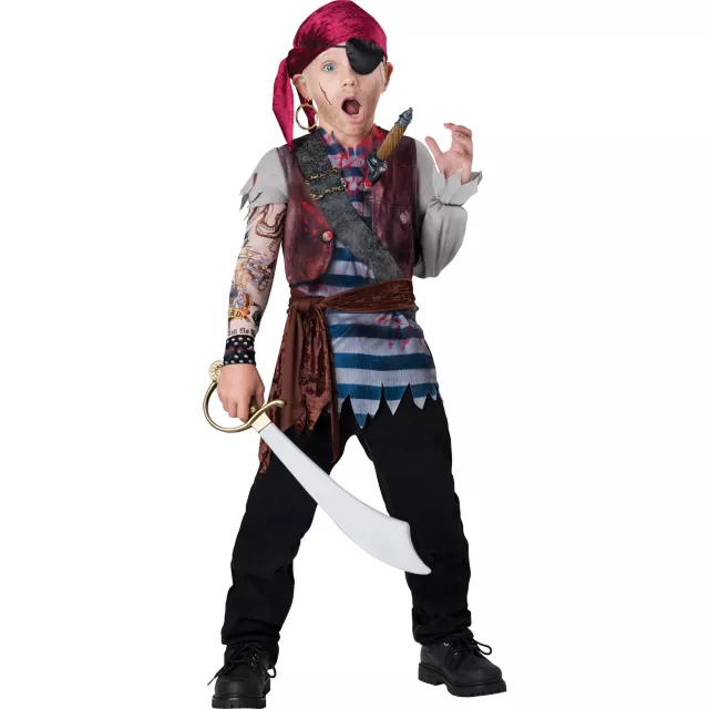 If it's buried treasure you seek, then you must start with the Dead Mans Chest Pirate Child Costume. This blood-stained shirt features a dagger impaled in the chest and comes complete with detachable chest straps, waist sash, faux tattoo sleeves and a red head scarf.