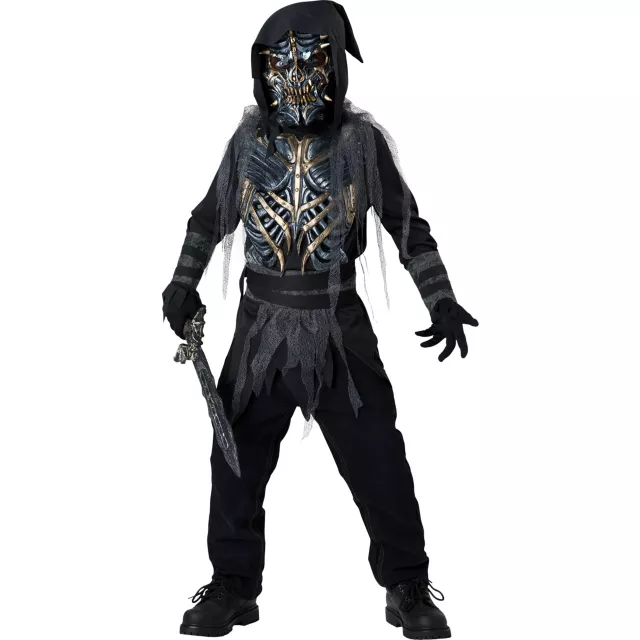 You'll be the master of death when you wear the Death Warrior Child Costume. This spooky costume consists of a black shirt, sculpted chest piece, hood, mesh shoulder drape, cuffs, waist sash and a highly detailed mask.