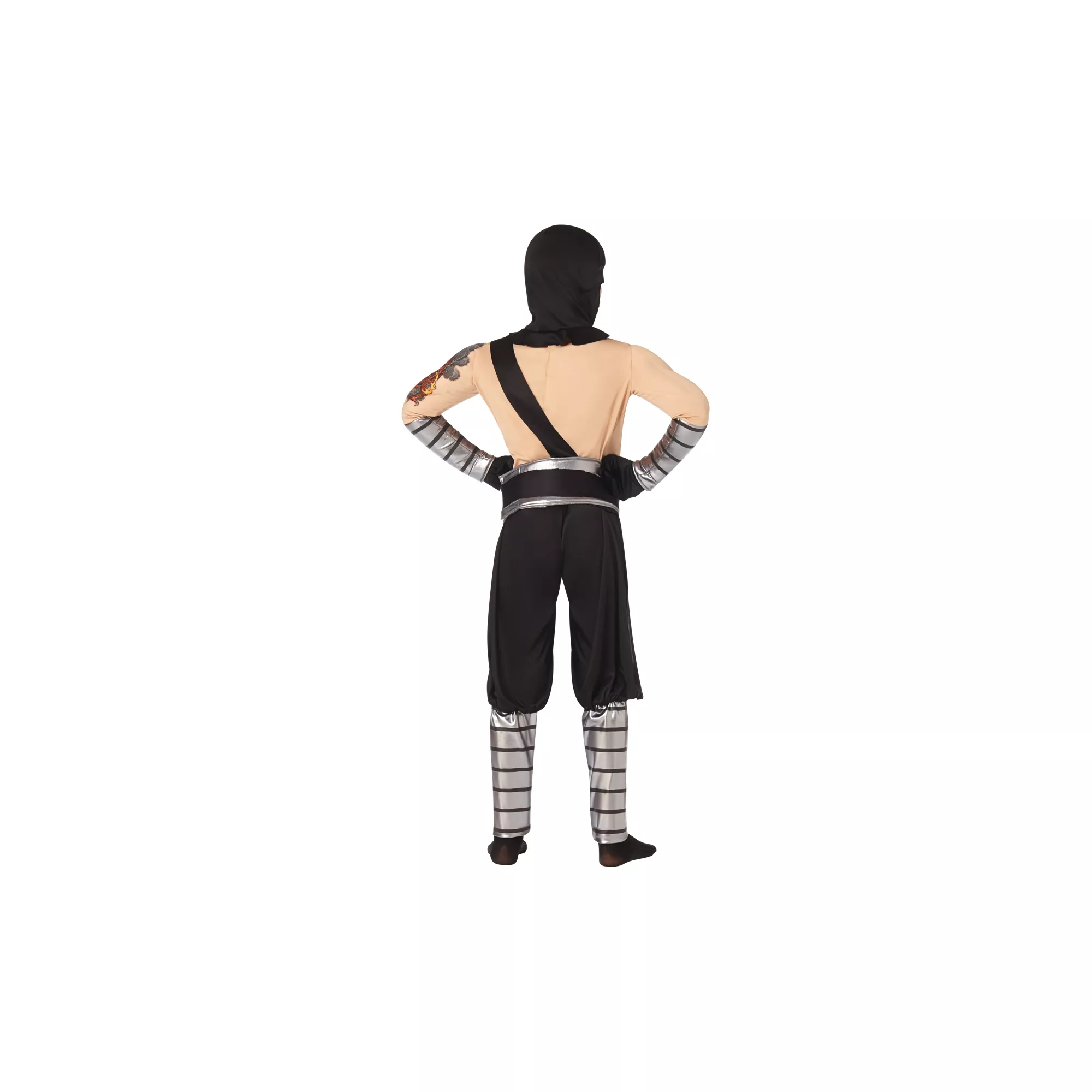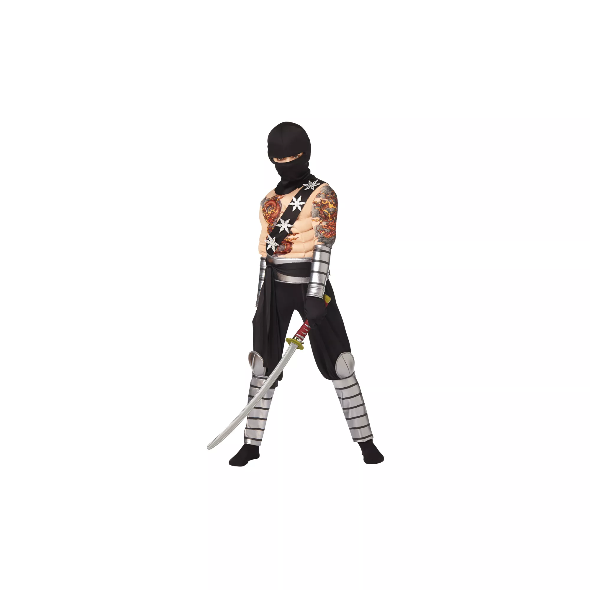 Destroy the competition on Halloween when you use your stealth skills wearing the Dragon Ninja Boys Costume. This muscle chest jumpsuit features attached arm and leg gauntlets, a waist belt with ninja star and a black hood.