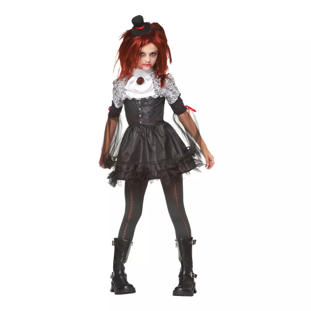Take over the runway, or the party, in this over-the-top Edgy Vamp child costume. The dark, 100% polyester dress and attached jabot come complete with a matching headpiece. A little bit of punk, a touch of Goth and some Victorian flare make this outfit a must have.