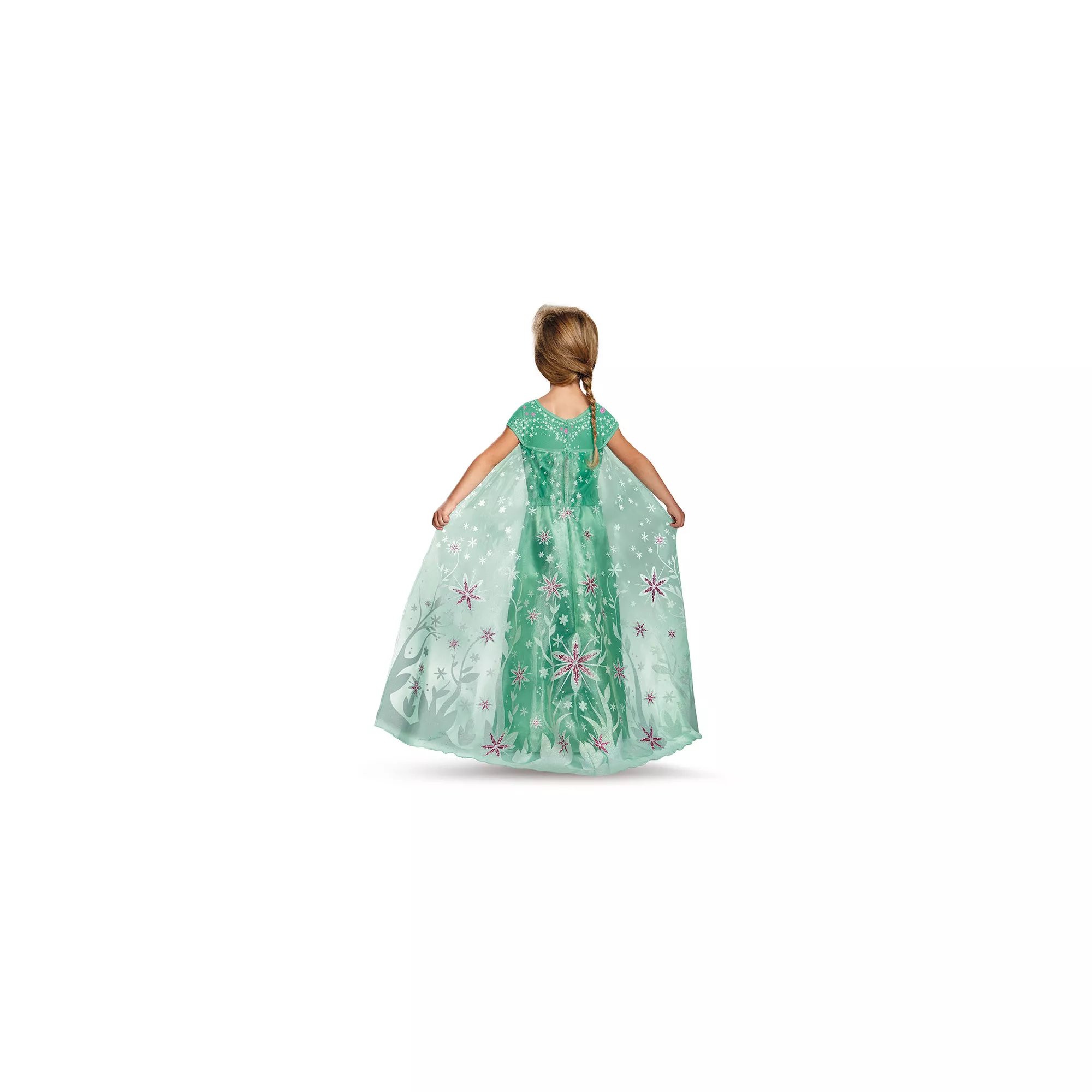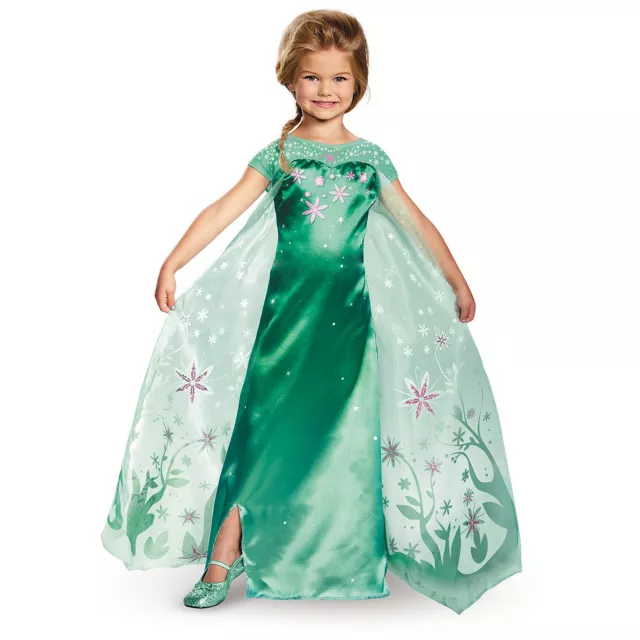 Look fabulous while preparing Anna's birthday celebration in this officially licensed Frozen Fever Deluxe Elsa Girl's Costume! Try not to catch a cold in this beautiful floor length dress with a small slit to the calf. The dress is accented in pink flowers and an attached cape with matching graphics. As you sneeze snowmen while trick-or-treating, you will still look great as Arendelle's queen!
