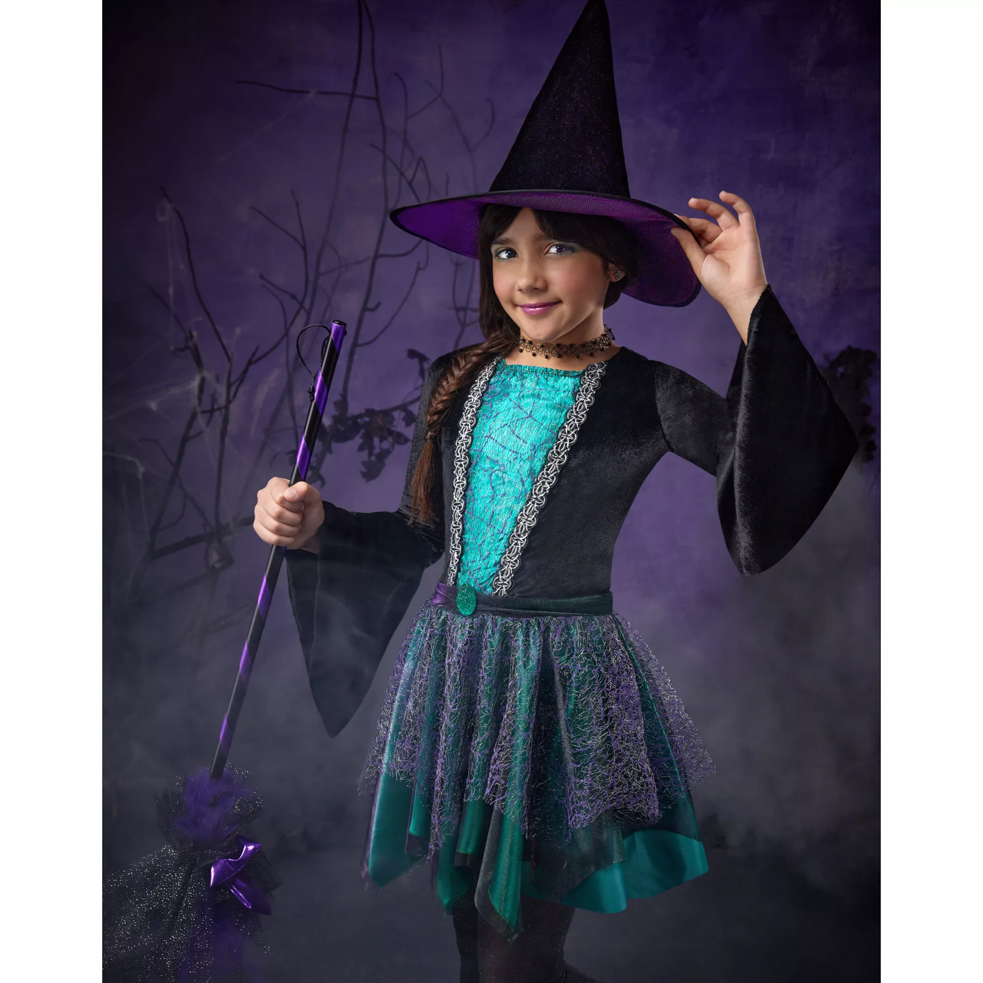 Instantly transform into a mystical enchantress this Halloween when you wear this awesome costume! Featuring a magical dress, black tights, and the signature witch hat, your child will be casting spells all night long.