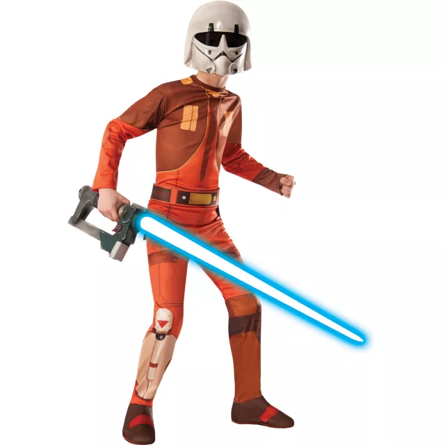 Become a rebel on Halloween when you decide to wear the officially licensed Star Wars Ezra Child Costume. This orange and red, polyester jumpsuit features character graphic details and comes complete with a belt and a character mask.